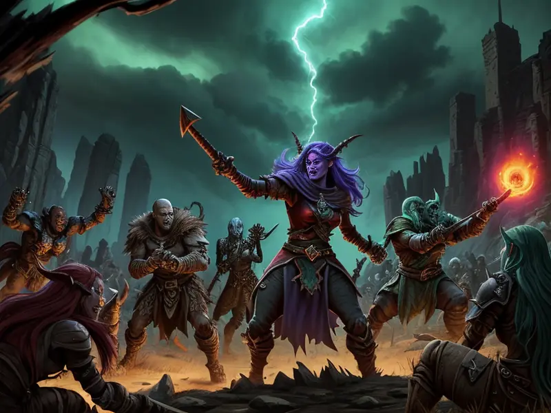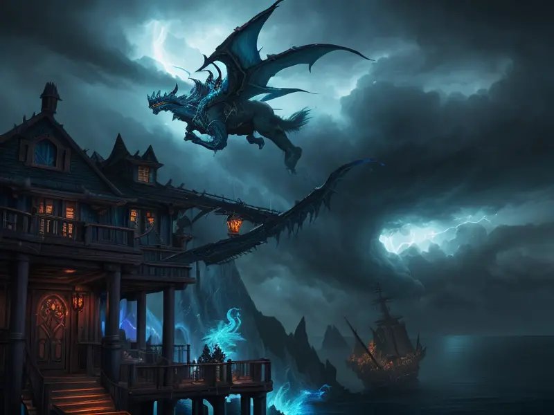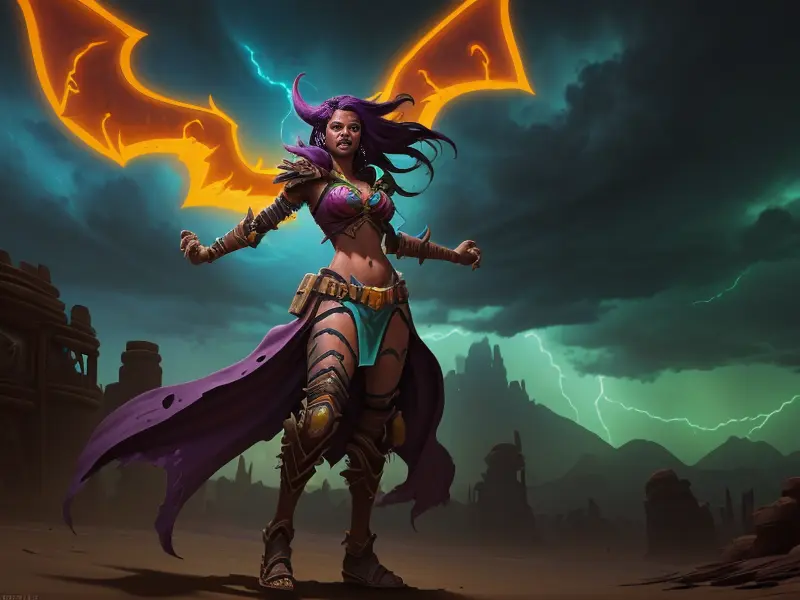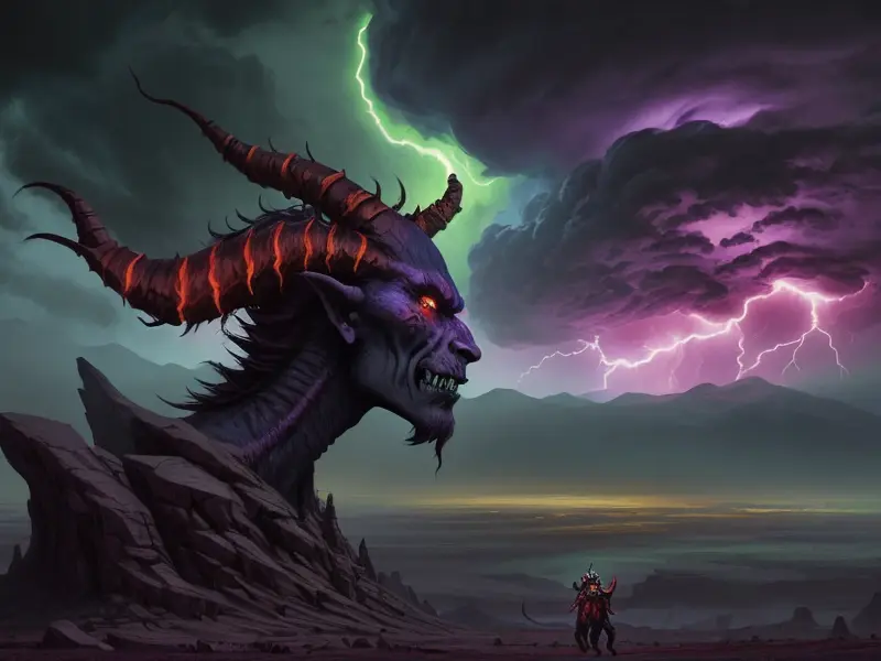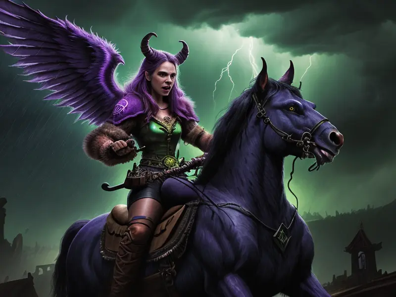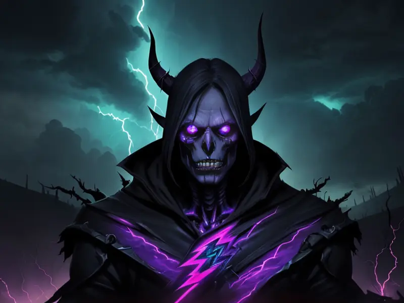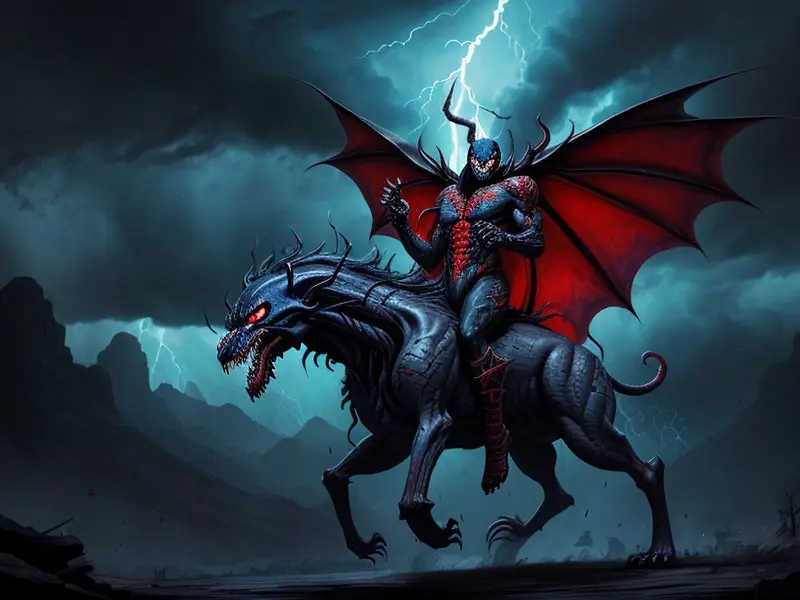 Illustration of Venom-marked Demon, Vampire, Riding storm cloud crackling with thunder, Very Rare, warcraft style, colorful and fun