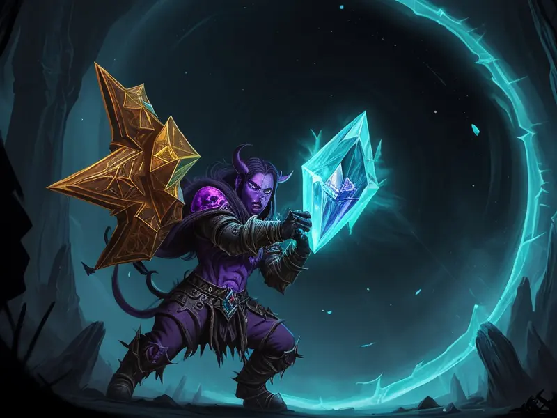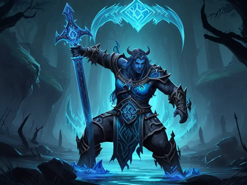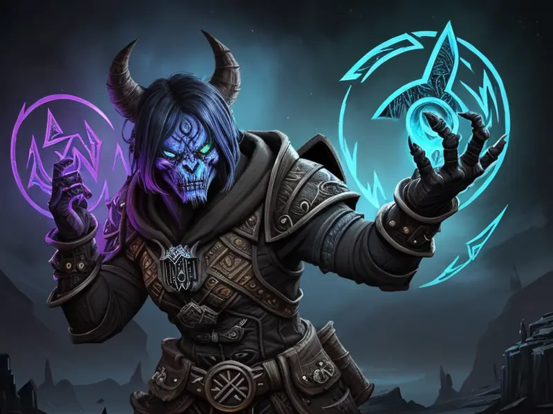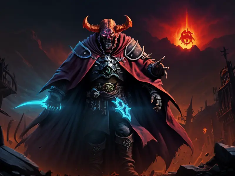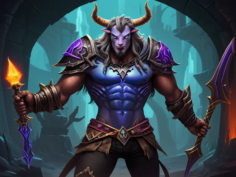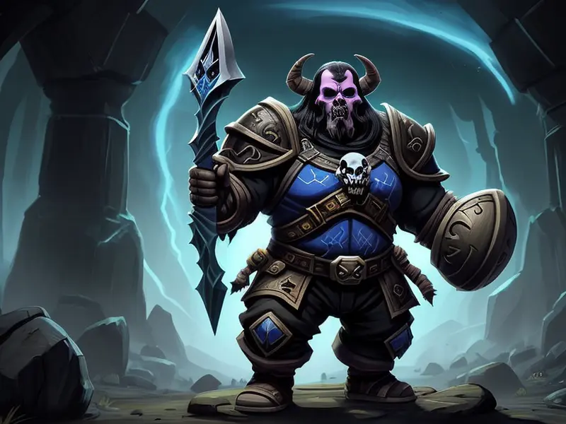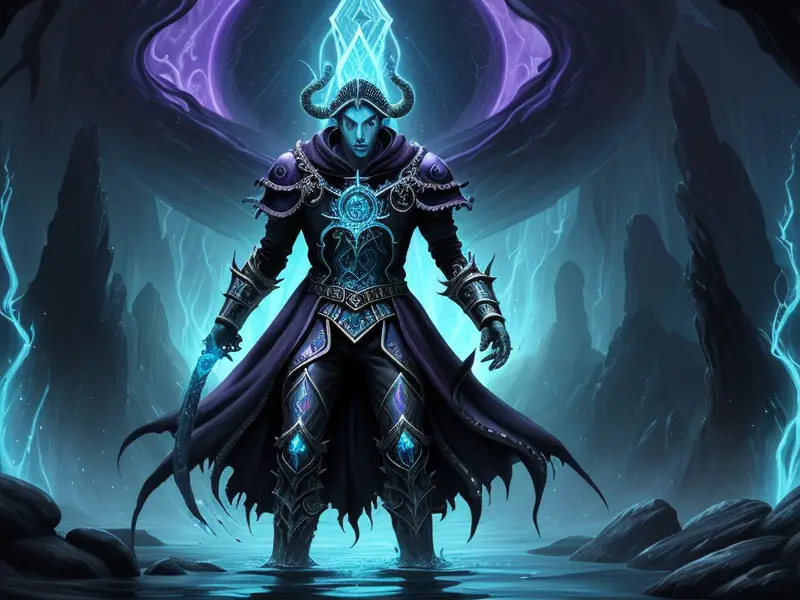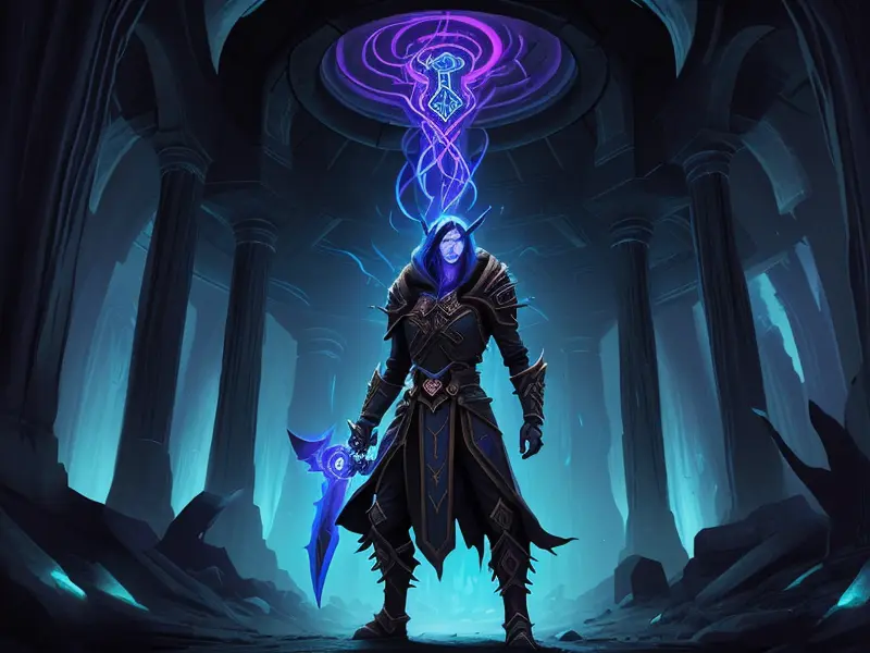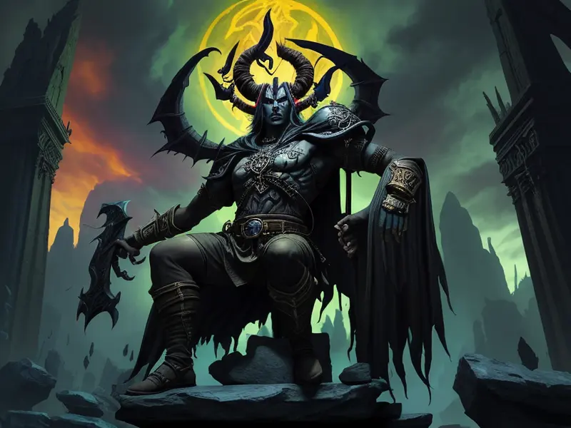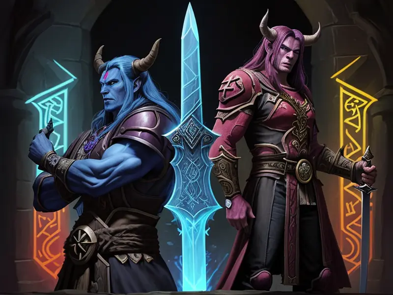 Illustration of Dawnlit Demon, Wraithblade, Inside a vault sealed by giant rotating runes, Epic, warcraft style, colorful and fun