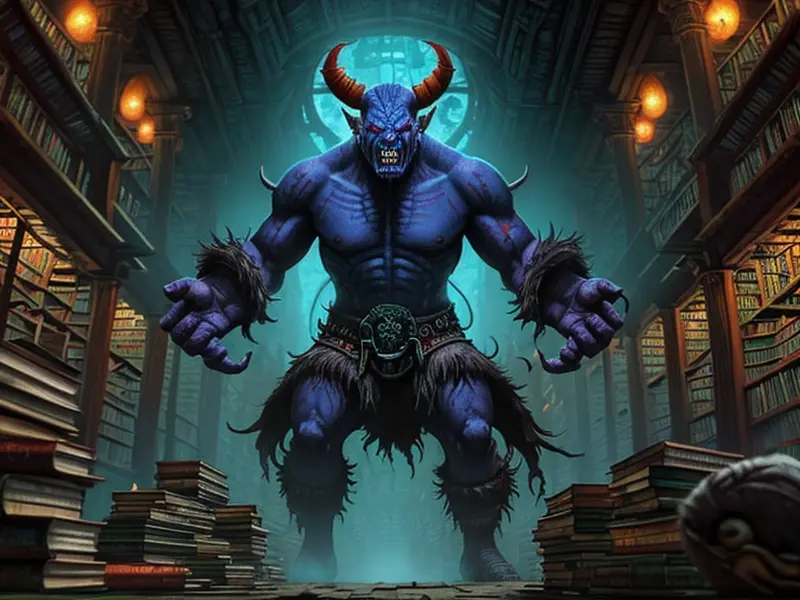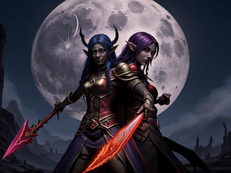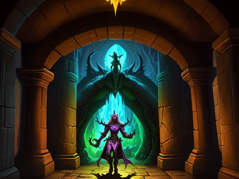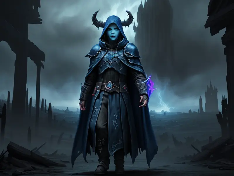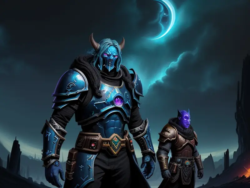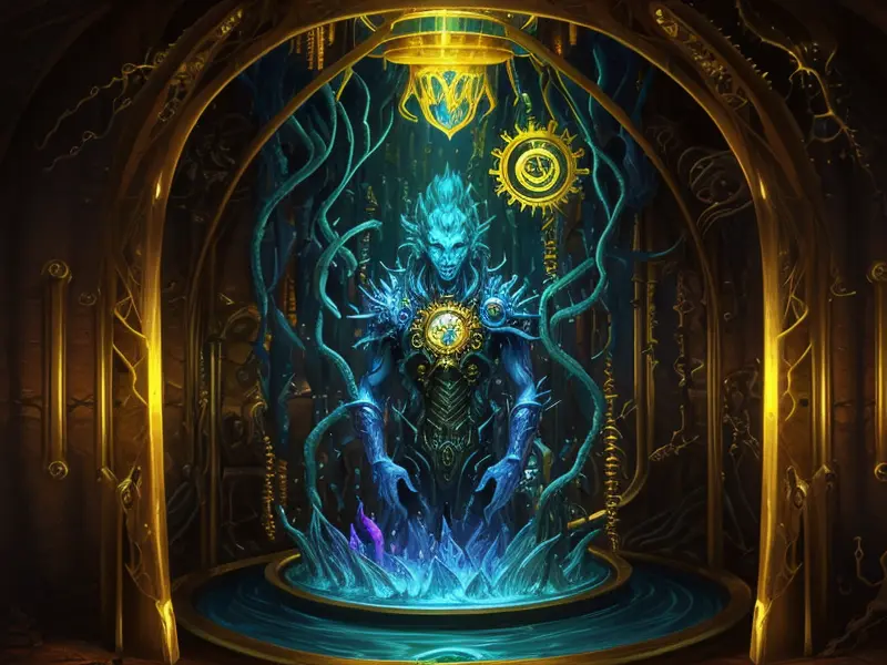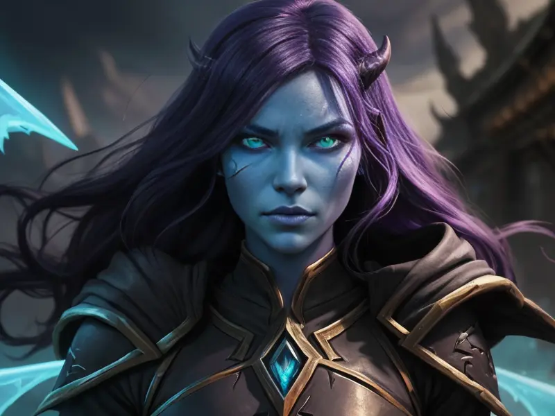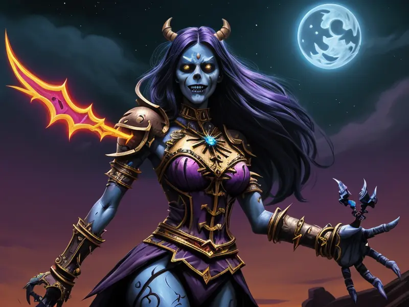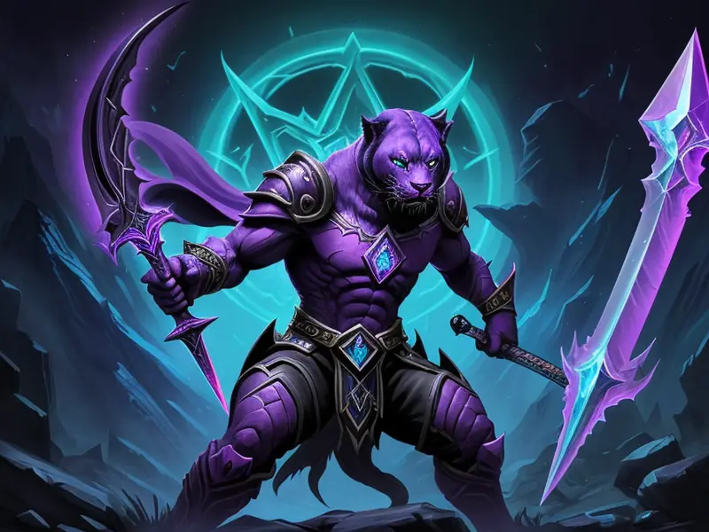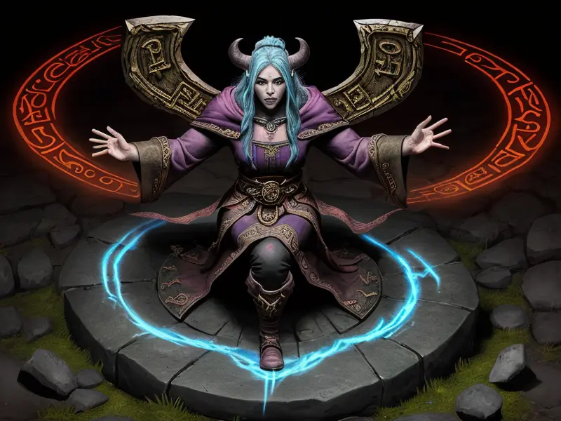 Illustration of Dawnlit Demon, Wraithblade, Inside a vault sealed by giant rotating runes, Epic, warcraft style, colorful and fun
