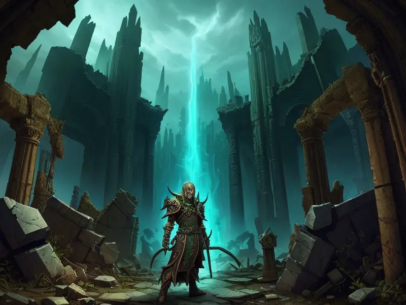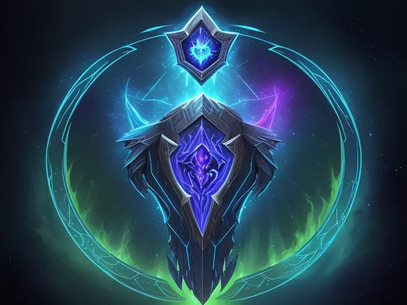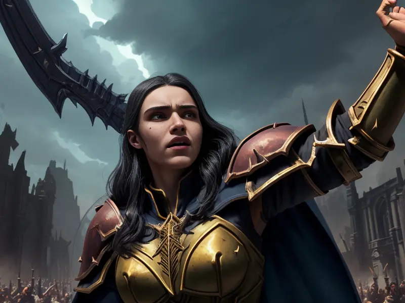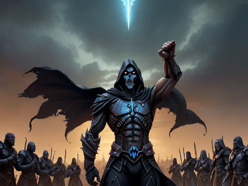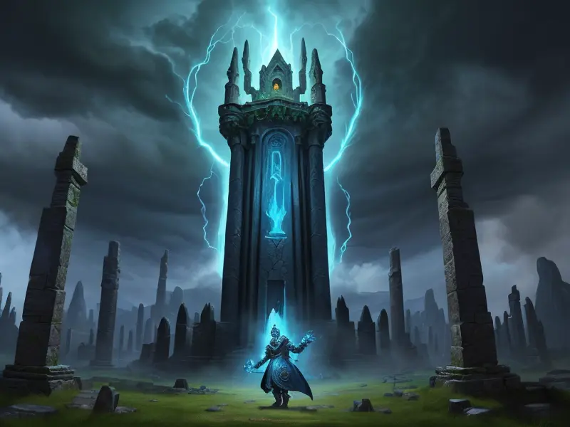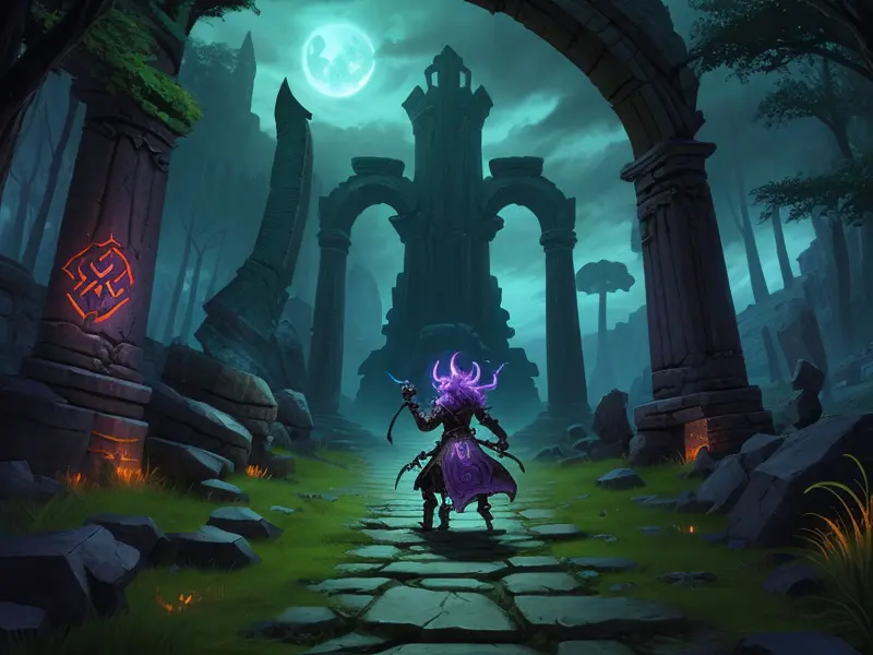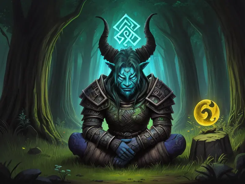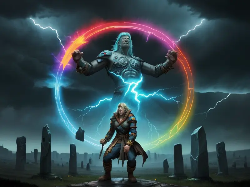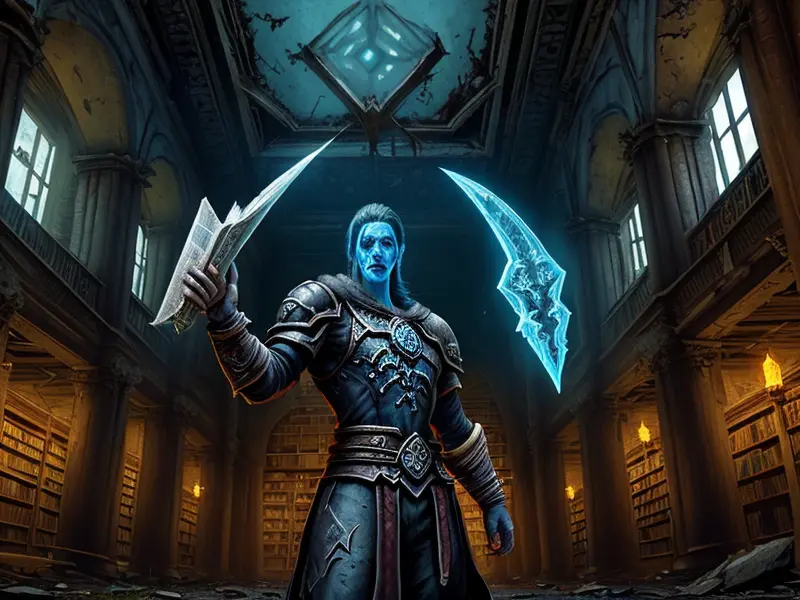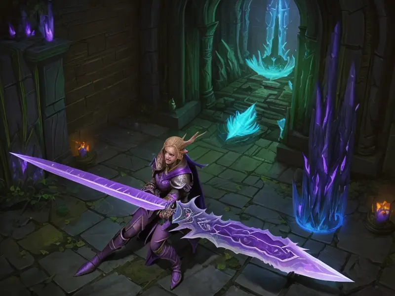 Illustration of Dawnlit Demon, Wraithblade, Inside a vault sealed by giant rotating runes, Epic, warcraft style, colorful and fun