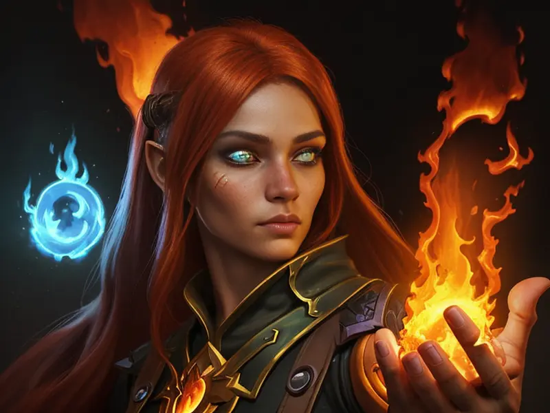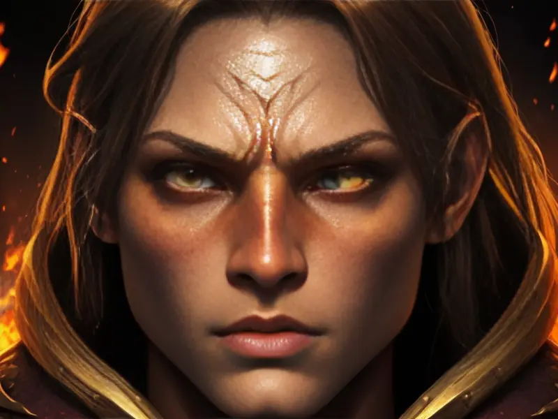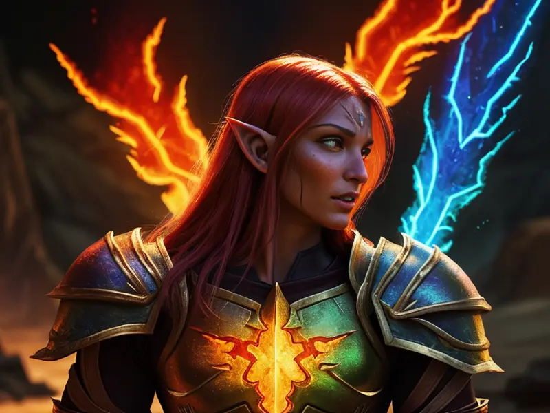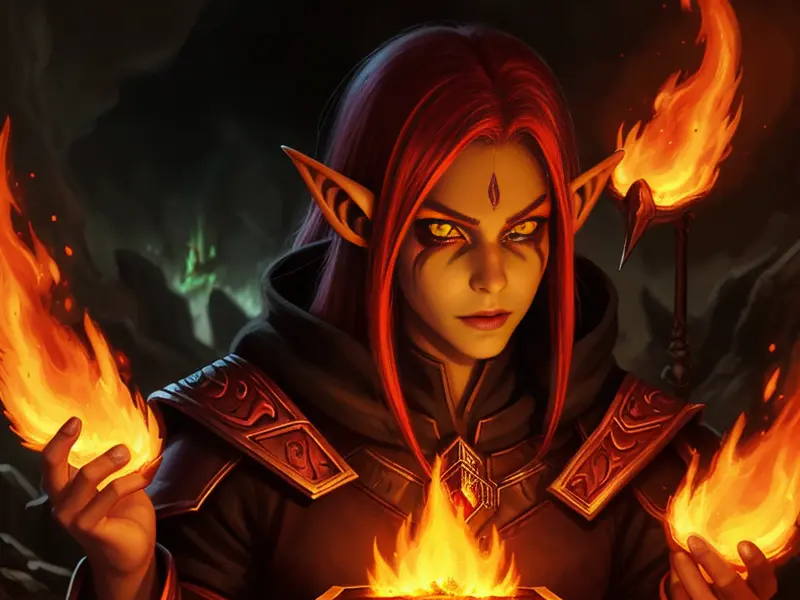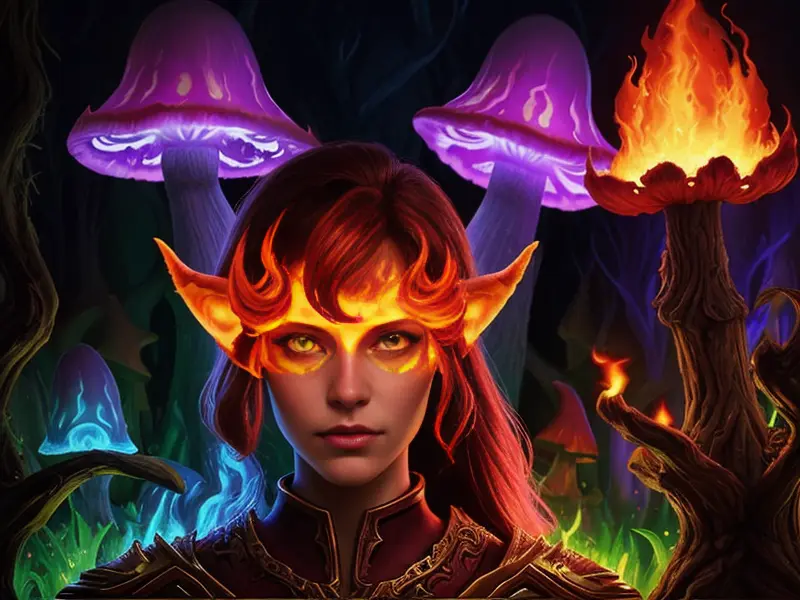 Illustration of Resourceful Elf, Illusionist, Flames erupt from their eyes, warcraft style, colorful and fun