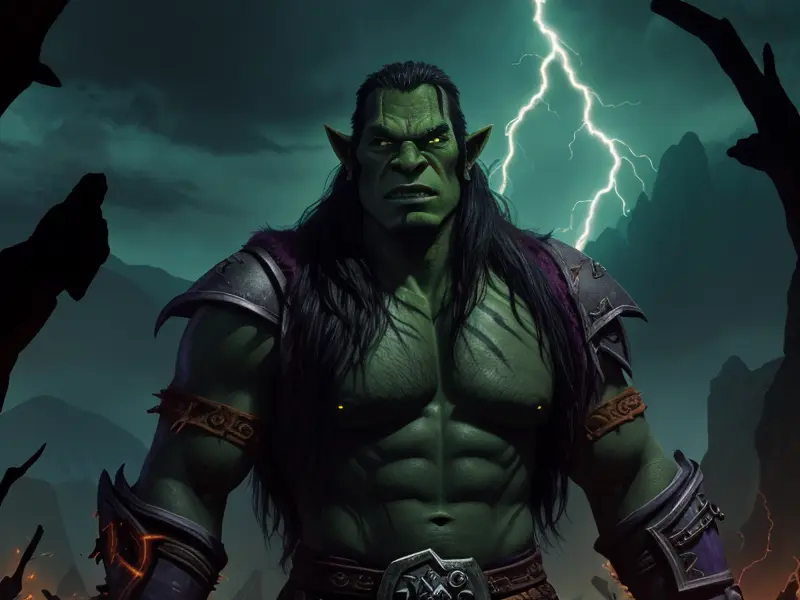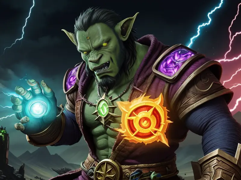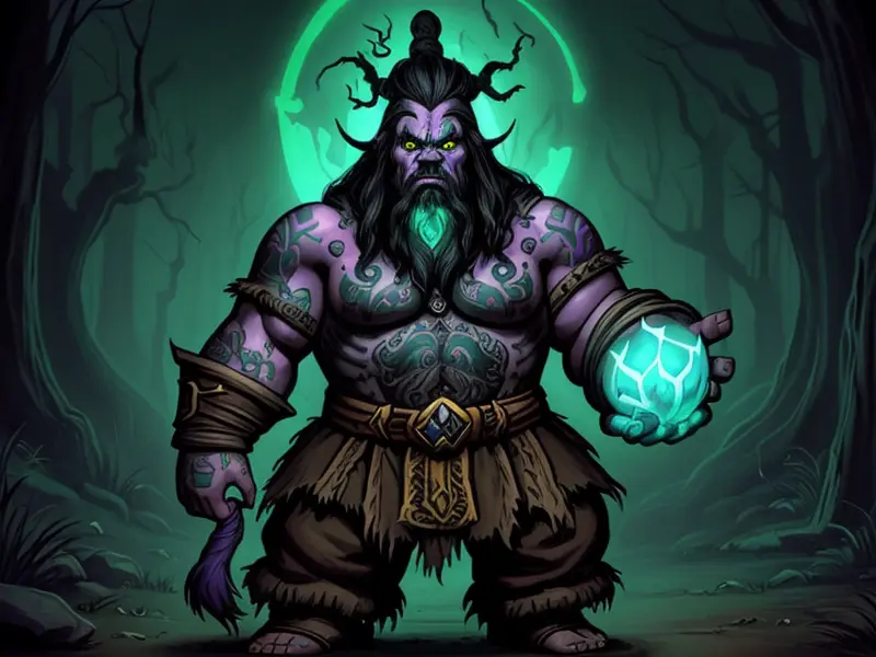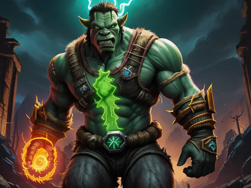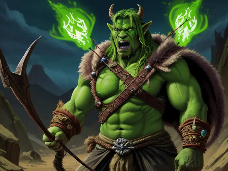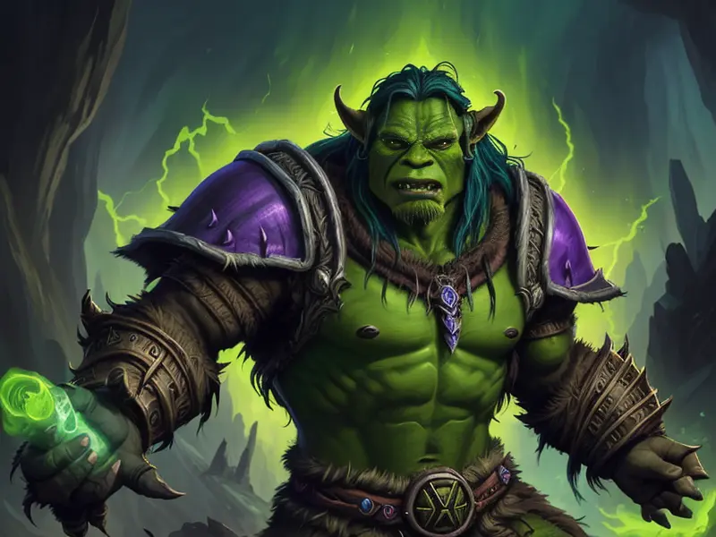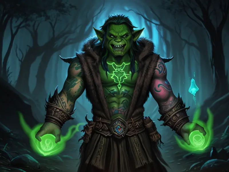 Illustration of Wild Orc, Druid, Armor that absorbs and stores magic, dynamic angle, Powerful, warcraft style, colorful and fun