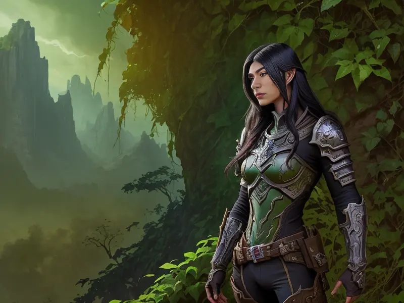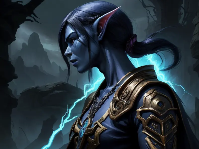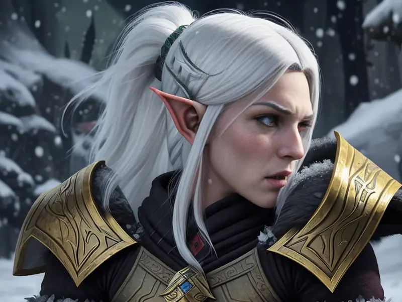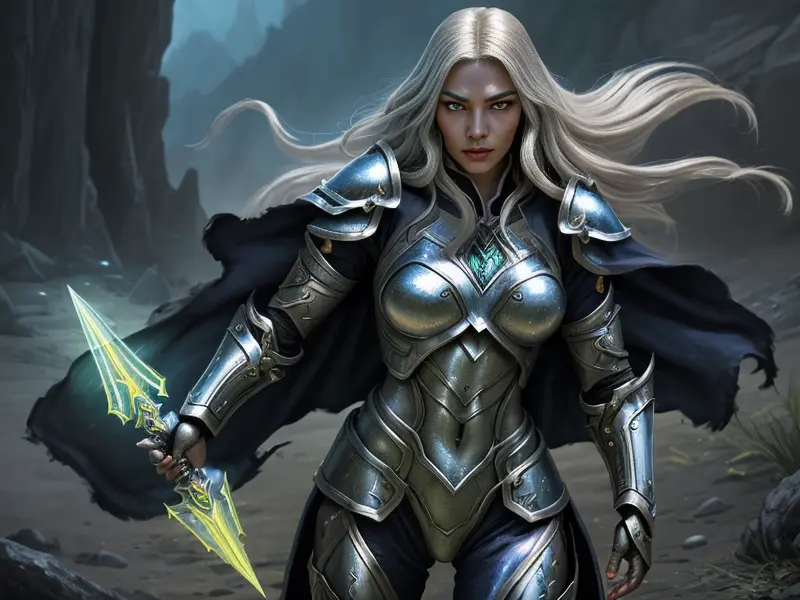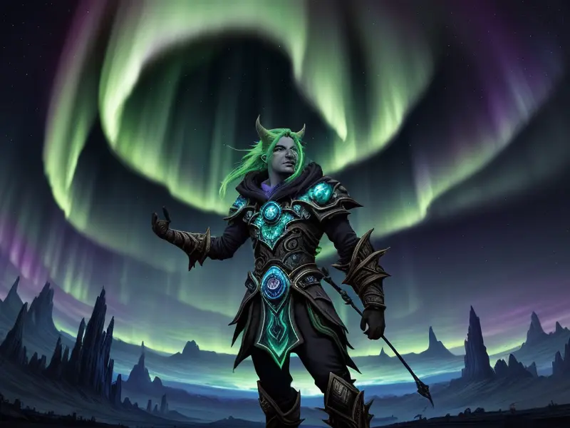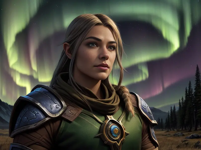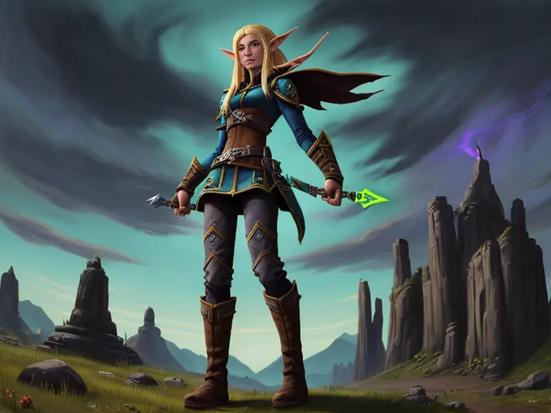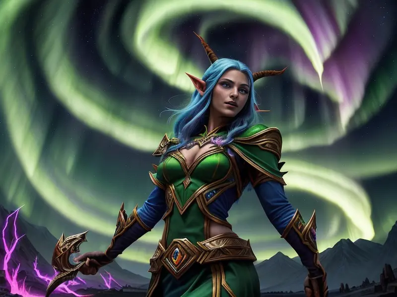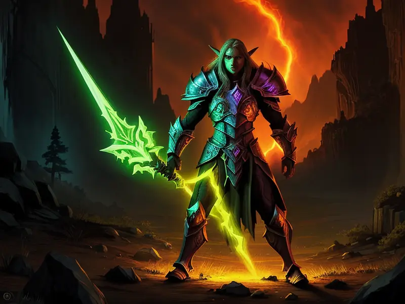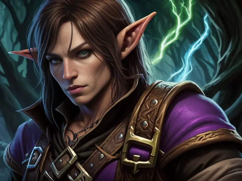 Illustration of Vengeful Elf, Trickster, Under a sky lit by shimmering auroras, Powerful, Robust, warcraft style, colorful and fun