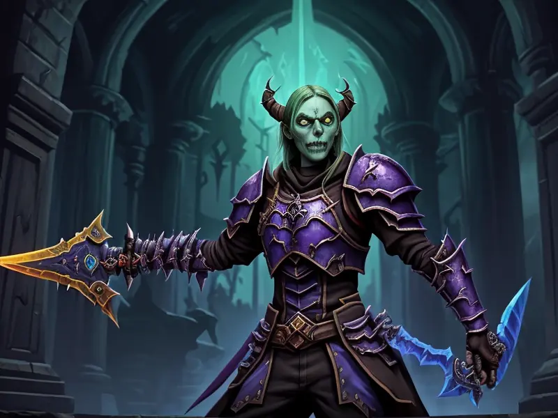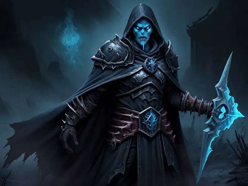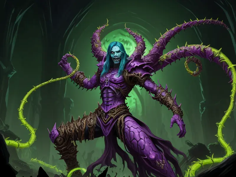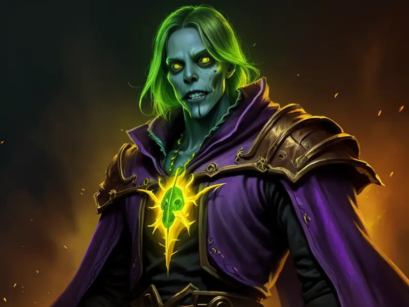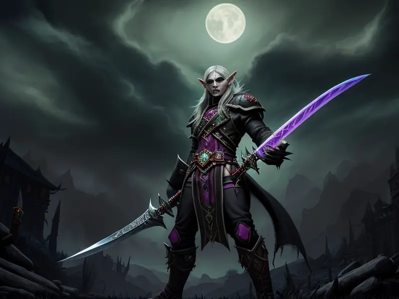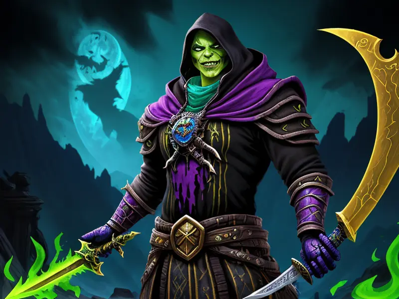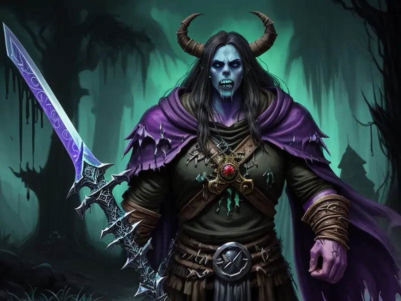 Illustration of Duskwoven Undead, Trickster, Sword dripping with poison, Epic, warcraft style, colorful and fun