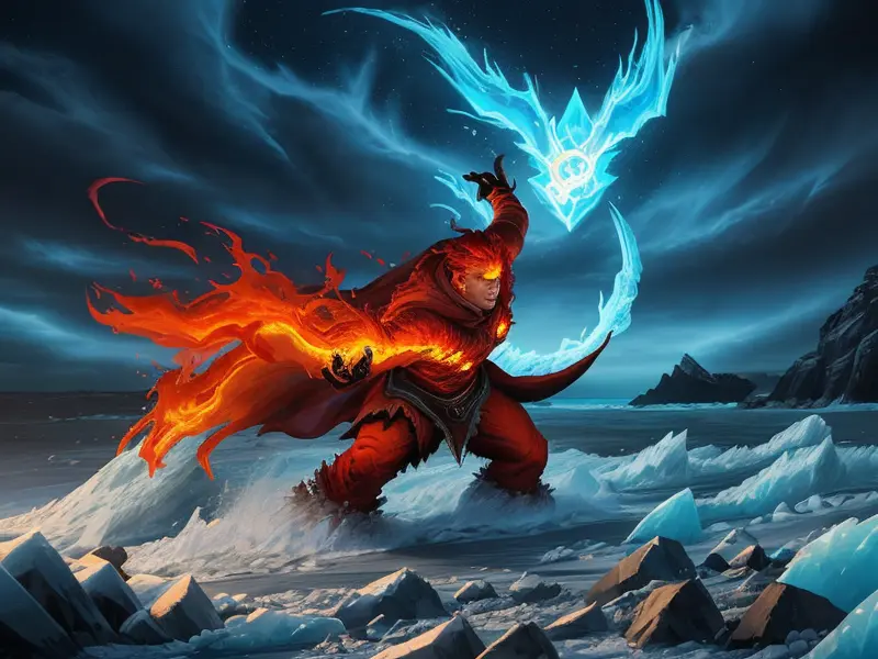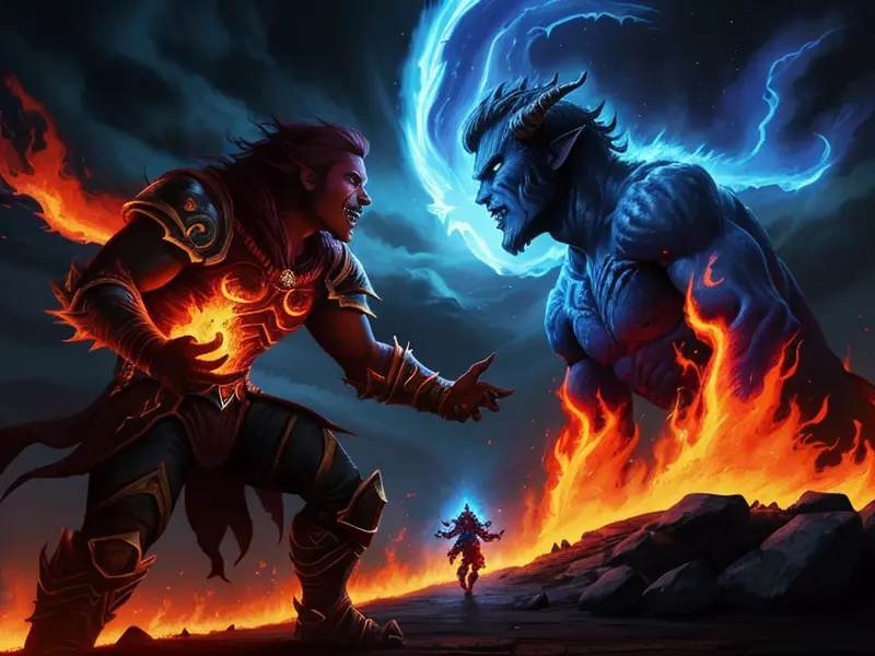 Illustration of Optimistic Fire Elemental, Cryomancer, Facing a colossal shadow beast in the distance, medium shot, Robust, warcraft style, colorful and fun