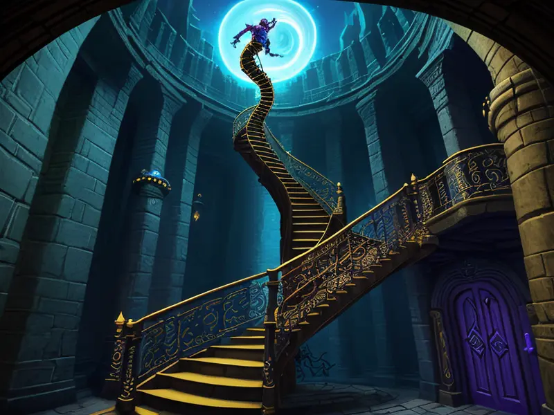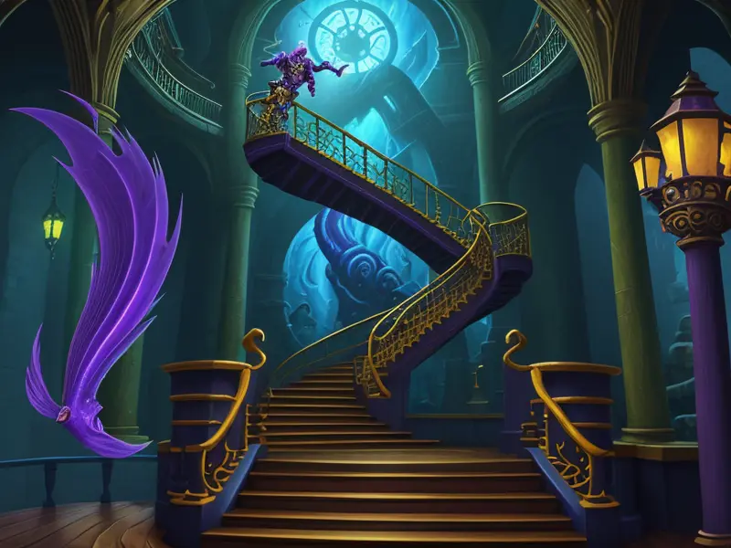 Illustration of Arcane Eel, On a spiral staircase suspended in the air, Robust, warcraft style, colorful and fun