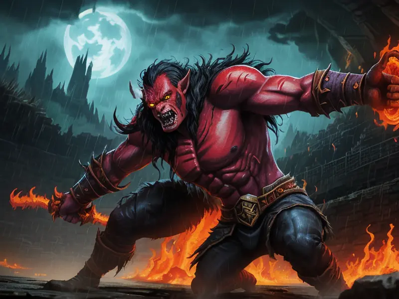 Illustration of Dawnlit Orc, Voidwalker, Feet leave fiery footprints wherever they go, Epic, warcraft style, colorful and fun