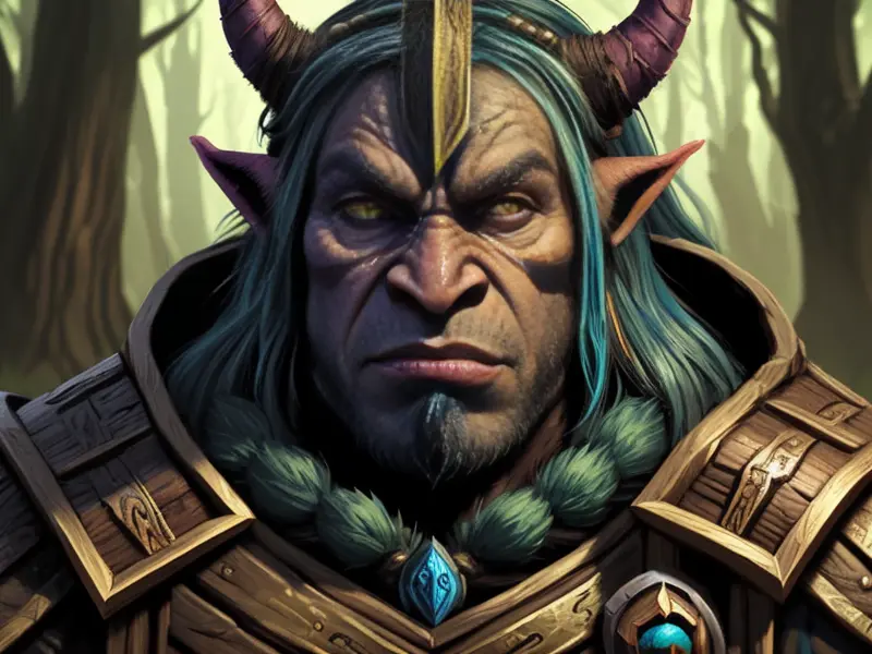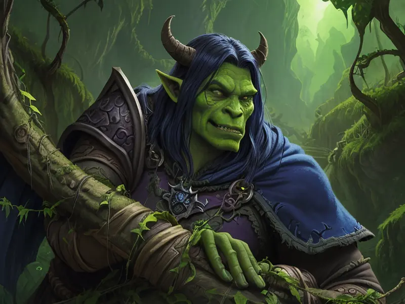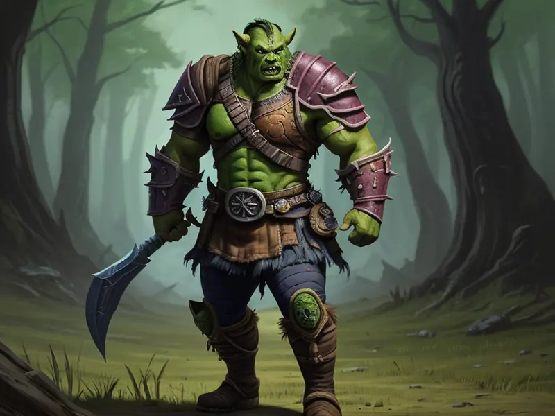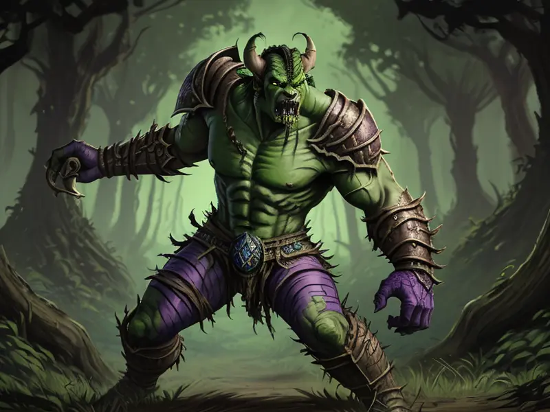 Illustration of Feral Orc, Blightbringer, A living vine coiled around one leg like armor, Epic, warcraft style, colorful and fun