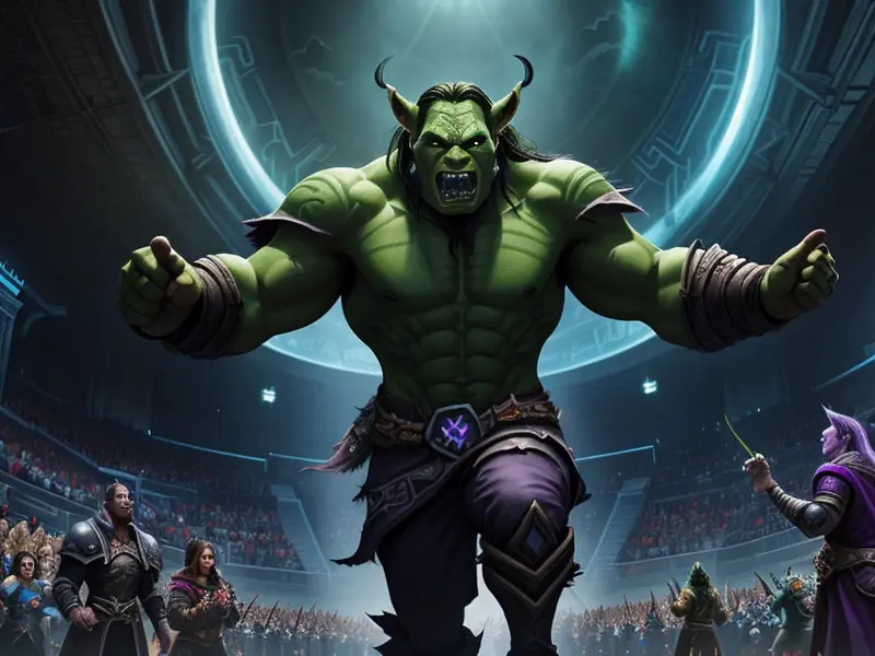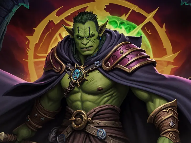 Illustration of Oathbound Orc, Warlock, In an arena, cheered on by an invisible crowd, Robust, warcraft style, colorful and fun