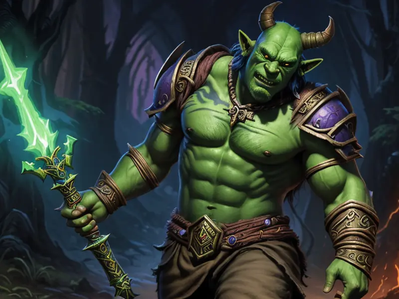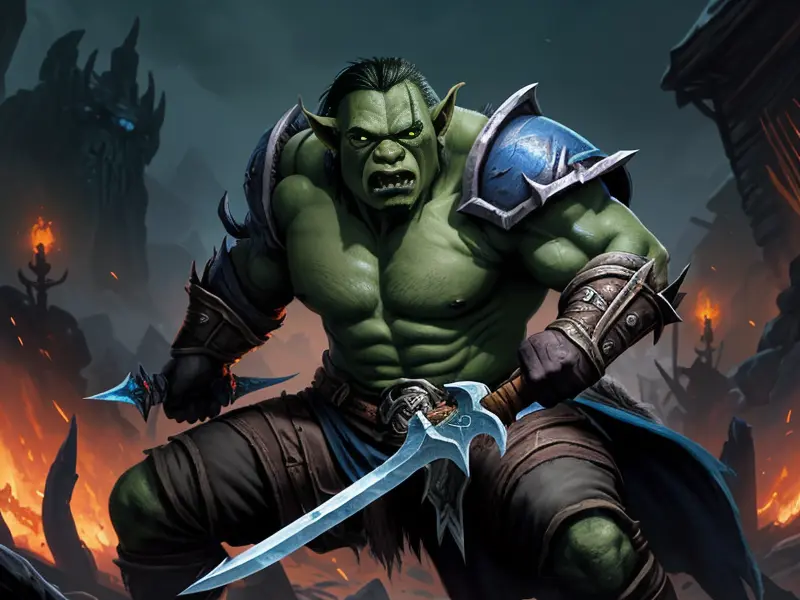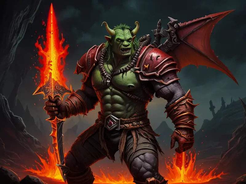 Illustration of Dominant Orc, Spellblade, Blade made of molten lava, Robust, warcraft style, colorful and fun
