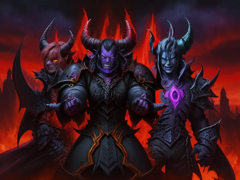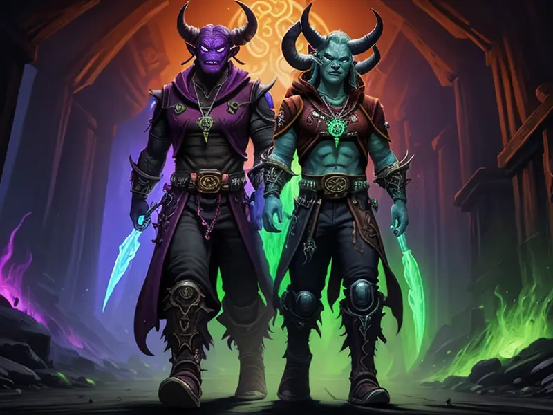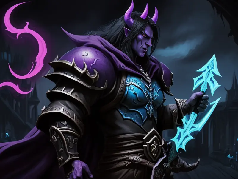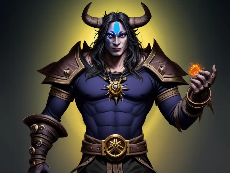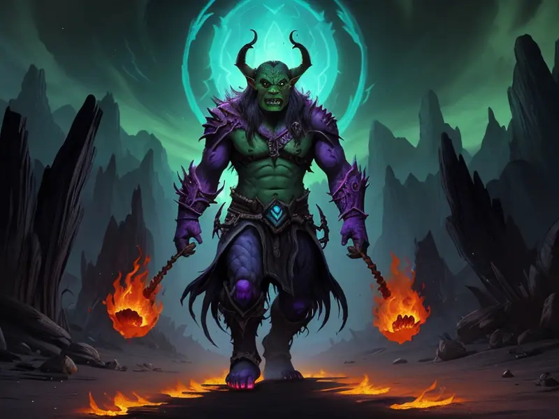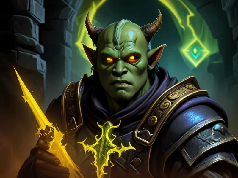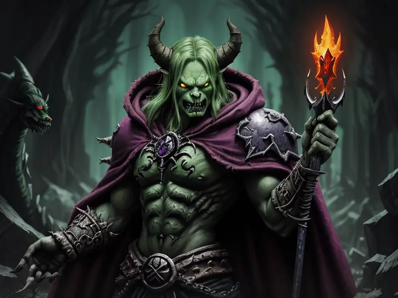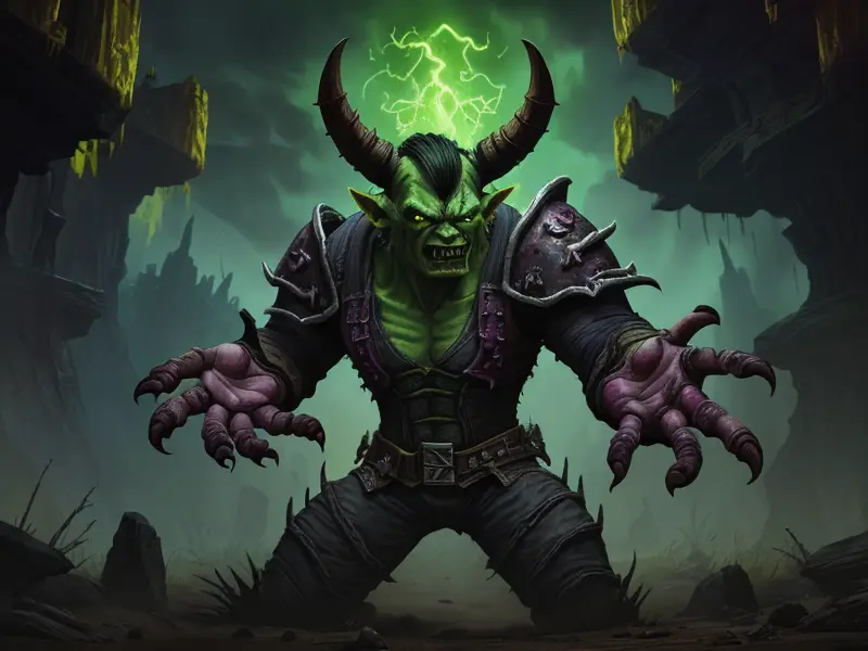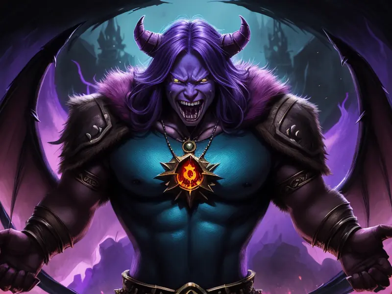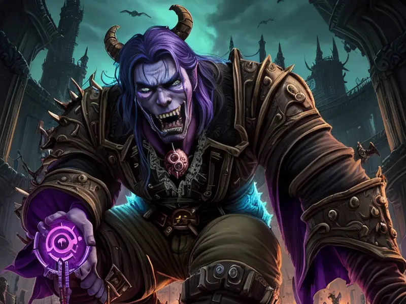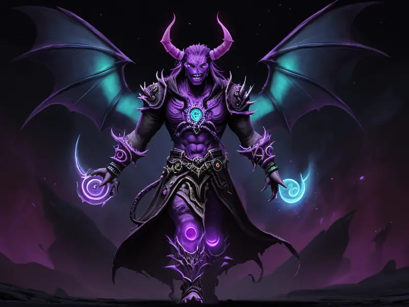 Illustration of Ambitious Demon, Voidwalker, Wears a bracelet that controls shadows, warcraft style, colorful and fun