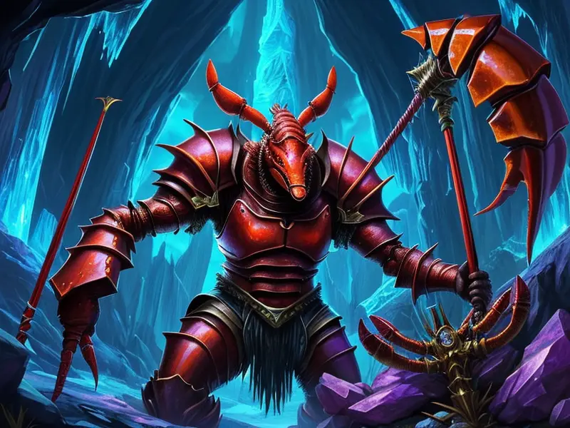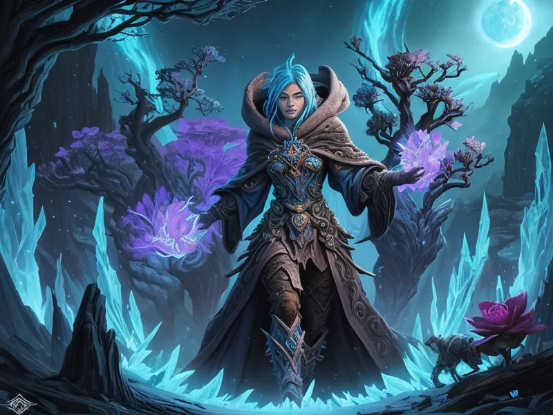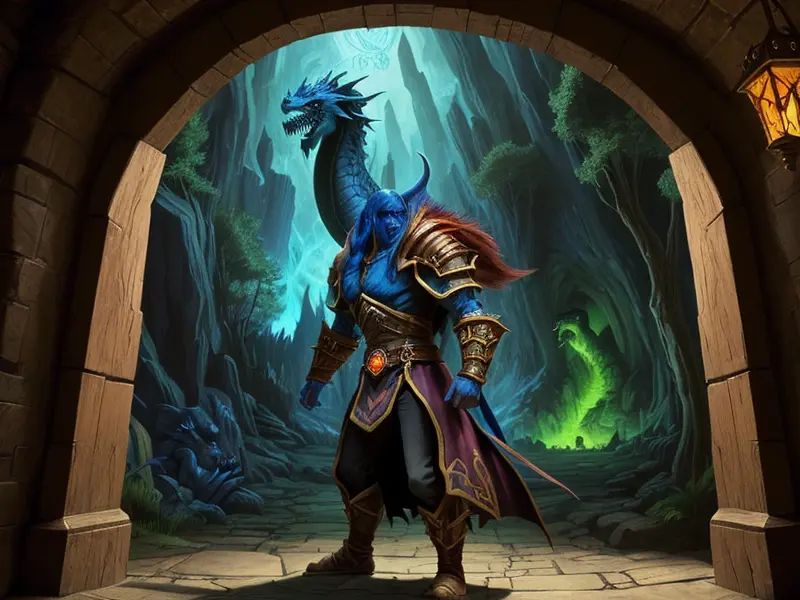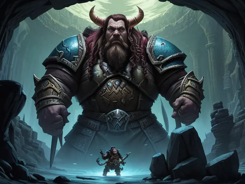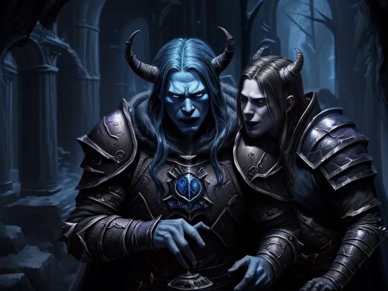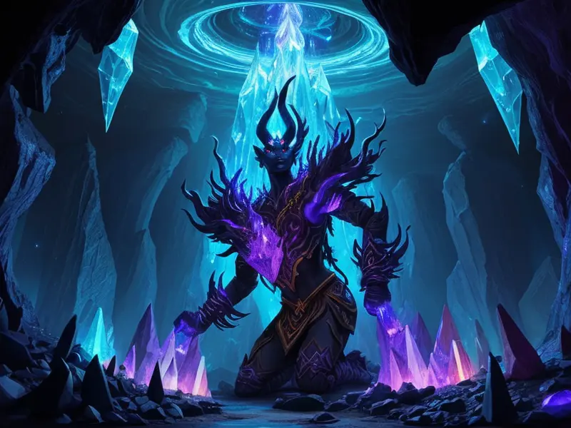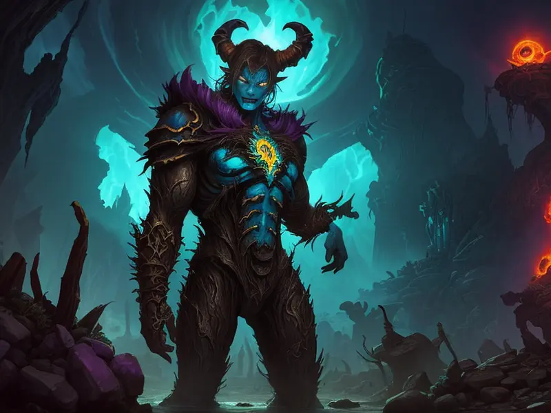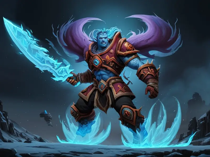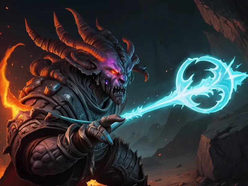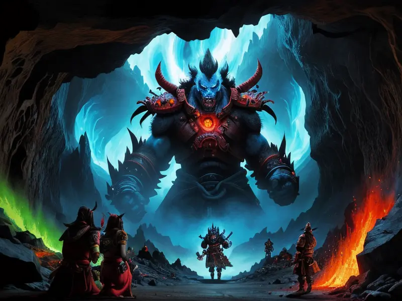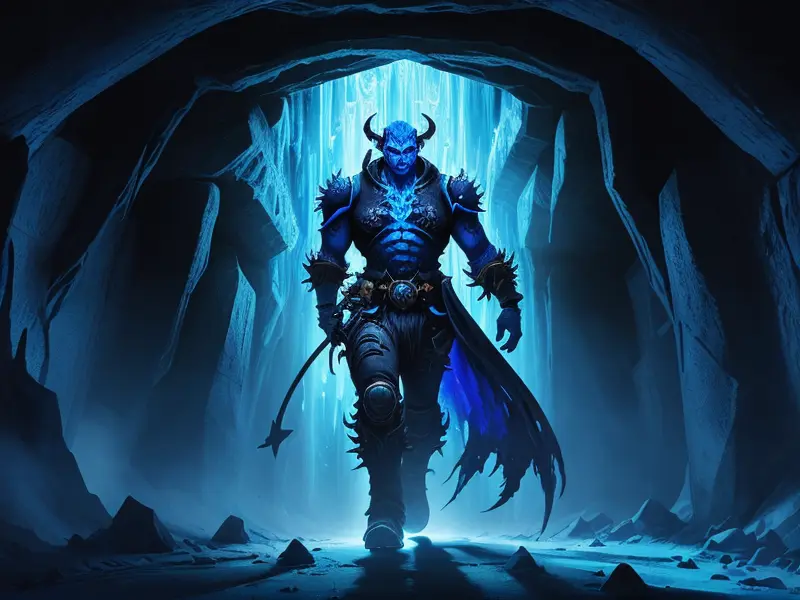 Illustration of Fallen Demon, Artificer, In a tunnel of glowing blue ice, wide angle shot, Powerful, Robust, warcraft style, colorful and fun