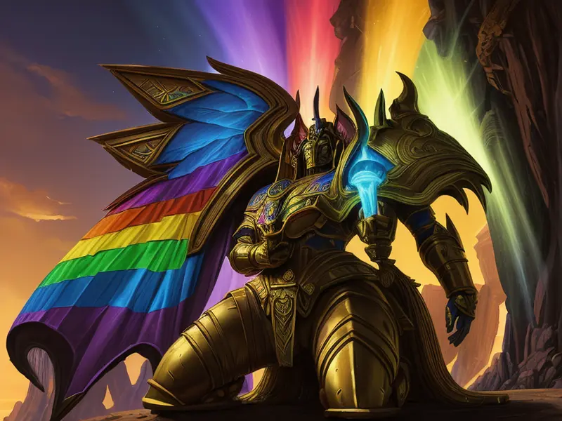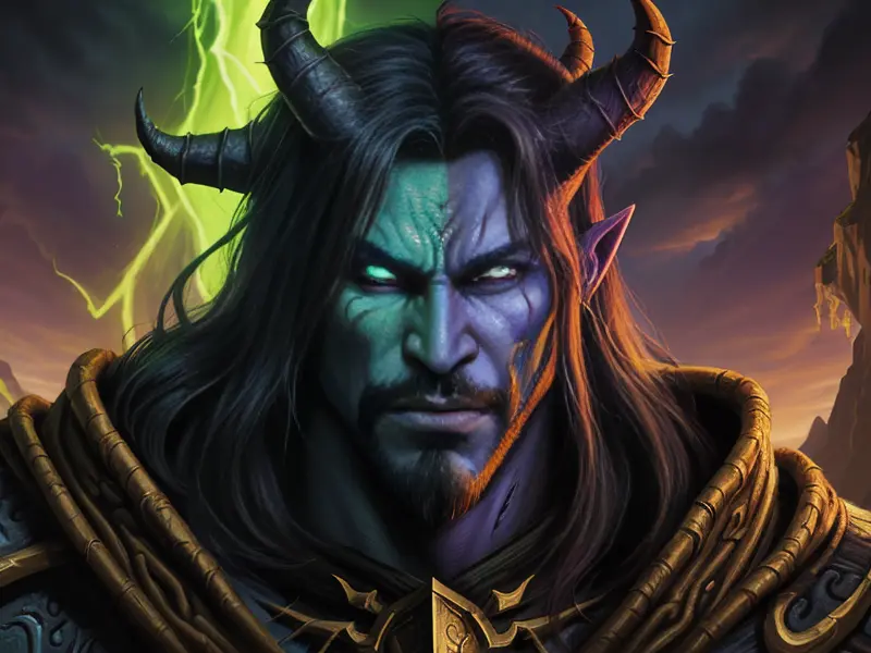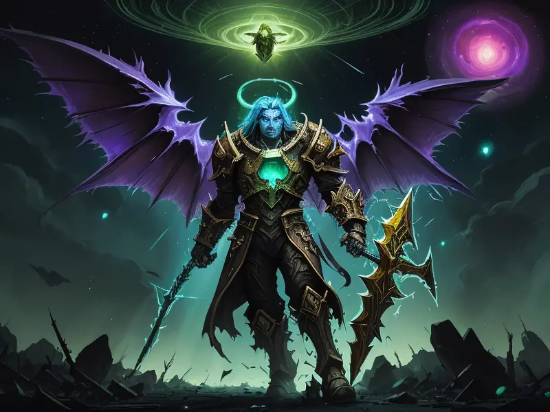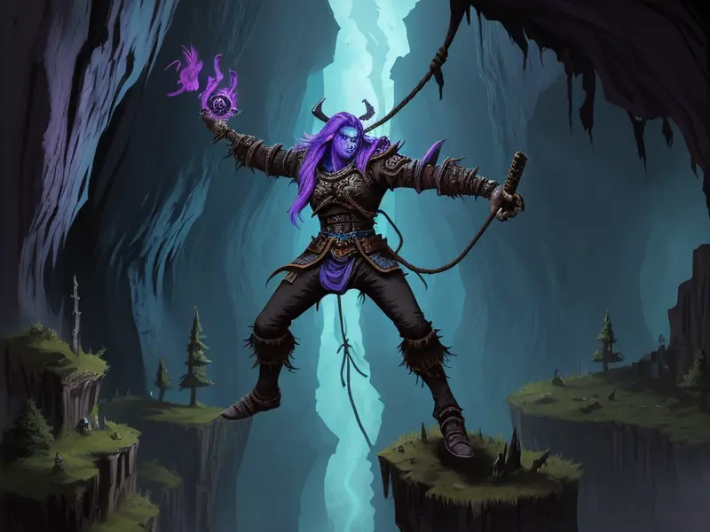 Illustration of Arcane Demon, Paladin, Clinging to cliff vines, close-up portrait, Robust, warcraft style, colorful and fun