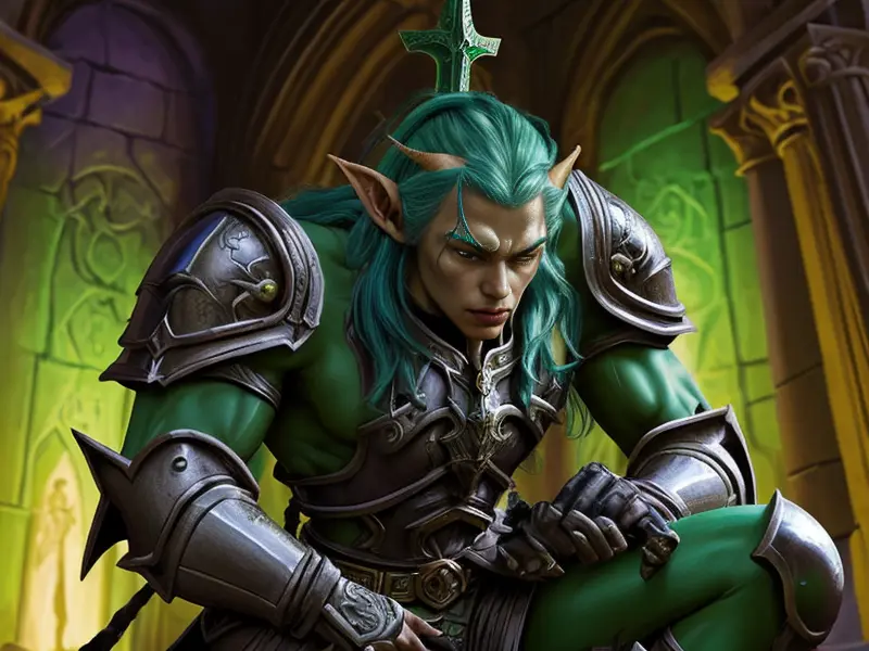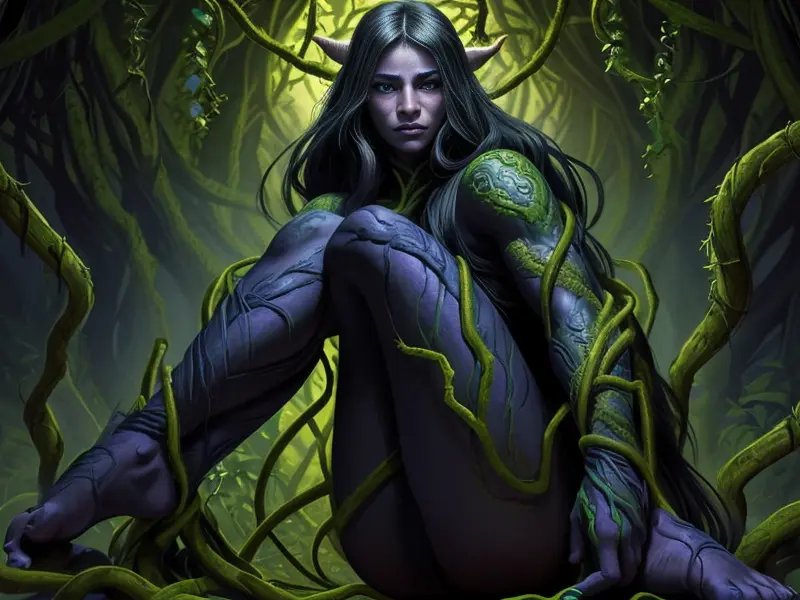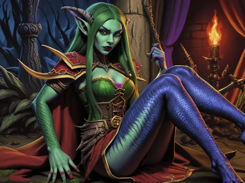 Illustration of Cursed Elf, Vampire, Legs covered in scales, warcraft style, colorful and fun