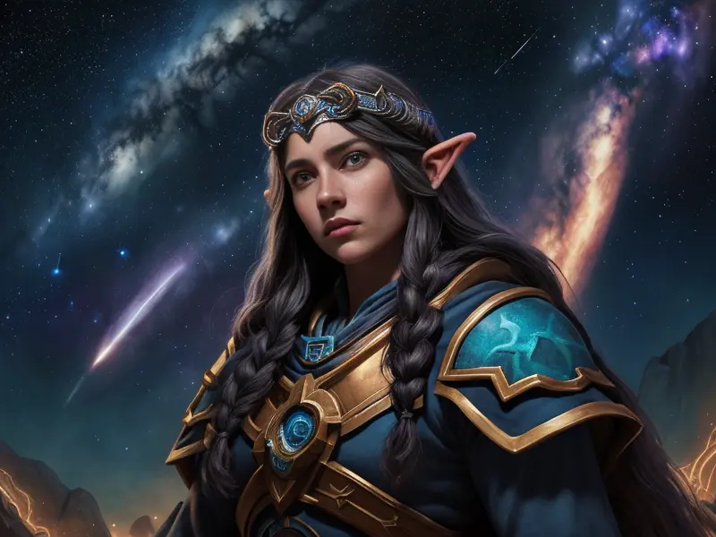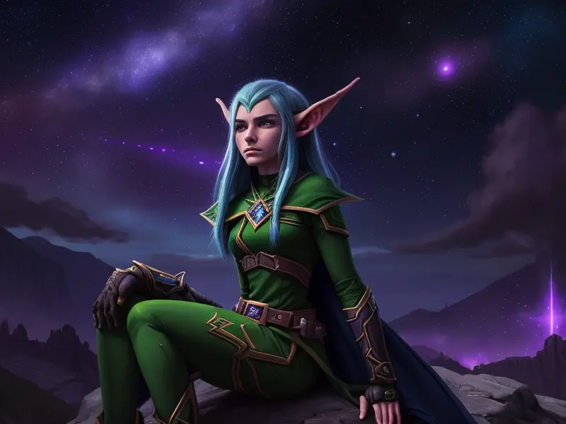 Illustration of Tenacious Elf, Psion, With a melancholic expression under a starlit sky, Weak, warcraft style, colorful and fun
