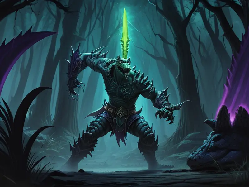 Illustration of Brave Alligator, Blade that absorbs the souls of the fallen, Powerful, Robust, warcraft style, colorful and fun