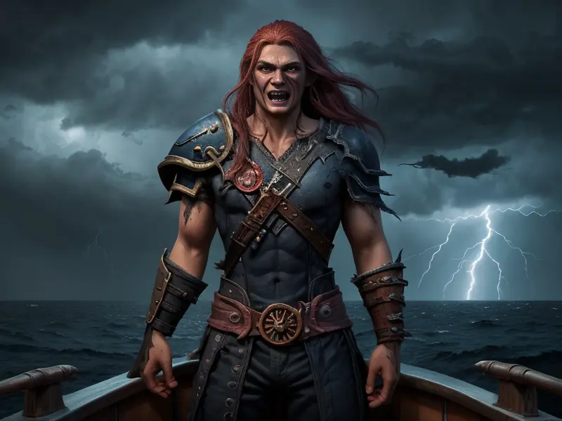 Illustration of Scarred Human, Vampire, On a ship sailing through a storm with lightning overhead, eye-level shot, heroic fantasy human, realistic human face, natural skin tones, normal human anatomy, Weak, Robust, warcraft style, colorful and fun