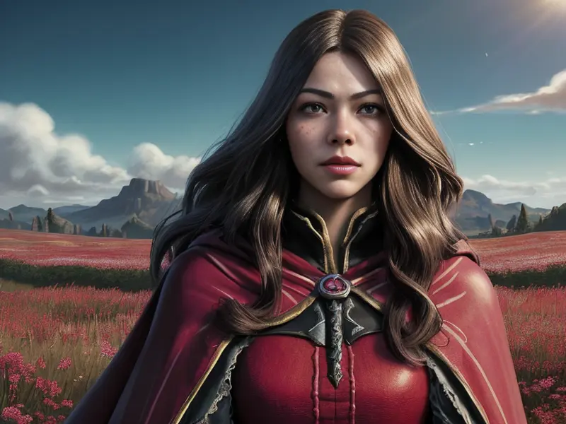 Illustration of Bloodstained Human, Oracle, In a windswept meadow, their cape flowing behind them, extreme close-up, heroic fantasy human, realistic human face, natural skin tones, normal human anatomy, Robust, warcraft style, colorful and fun