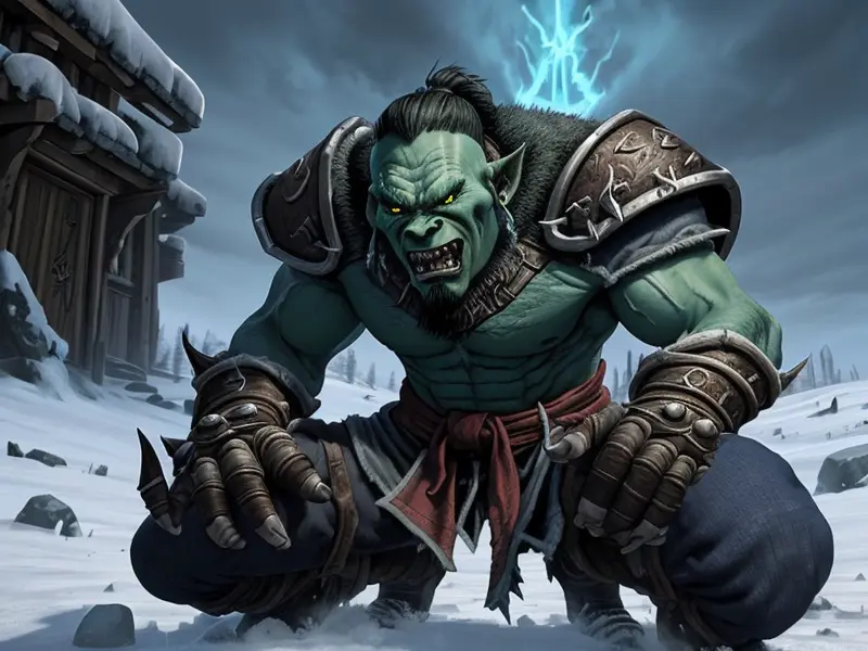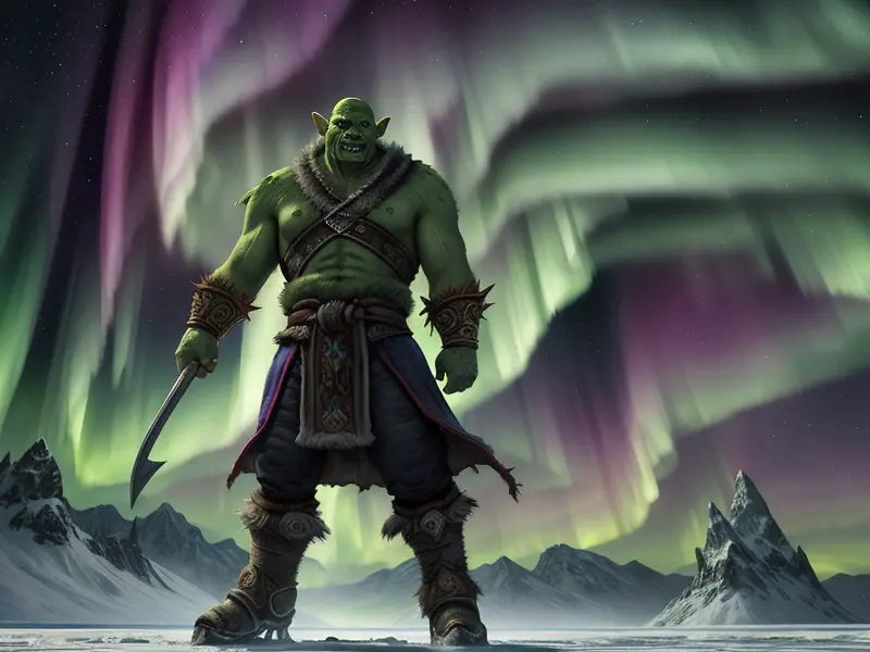 Illustration of Vengeful Orc, Monk, On a frozen lake under an aurora, Powerful, Robust, warcraft style, colorful and fun
