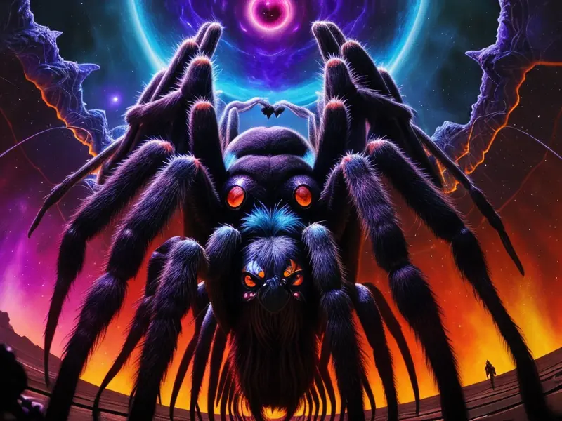 Illustration of Altruistic Tarantula, Aligning arcane lenses in cosmic observatory, low angle shot, warcraft style, colorful and fun