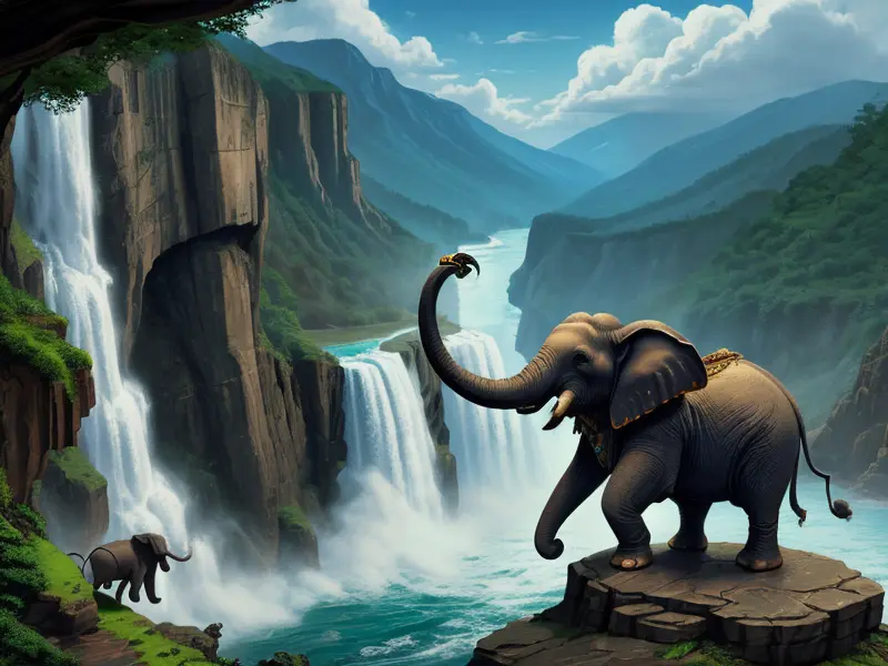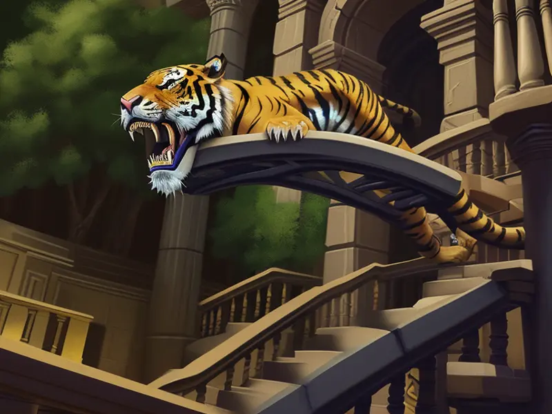Illustration of Fierce Saber-toothed Tiger, On a spiral staircase suspended in the air, high angle shot, Robust, warcraft style, colorful and fun