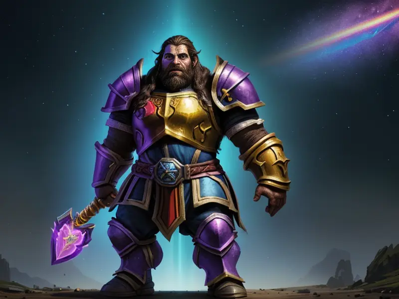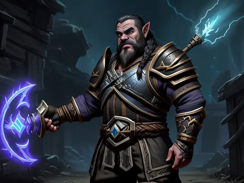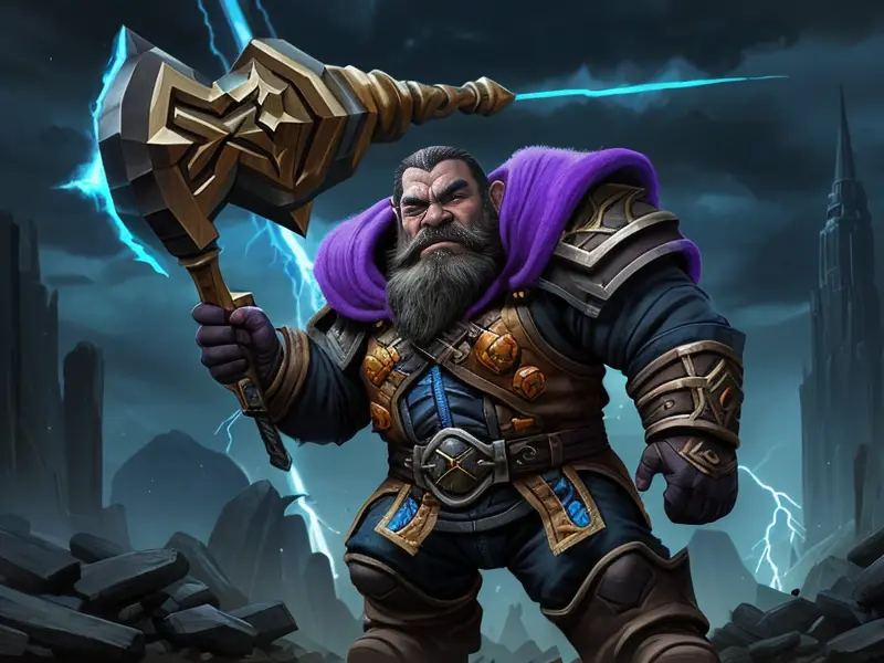 Illustration of Stealthy Dwarf, Chronomancer, Heavy hammer crackling with lightning, Robust, warcraft style, colorful and fun