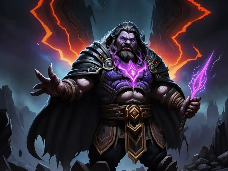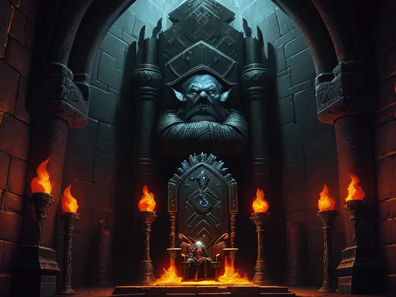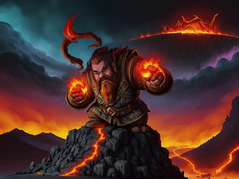 Illustration of Ironclad Dwarf, Enchanter, In a throne room carved from obsidian, flames dancing along the walls, Powerful, Robust, warcraft style, colorful and fun