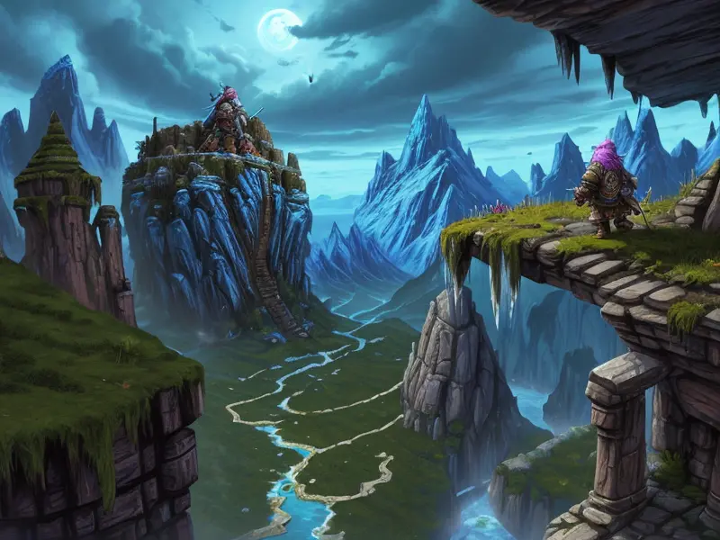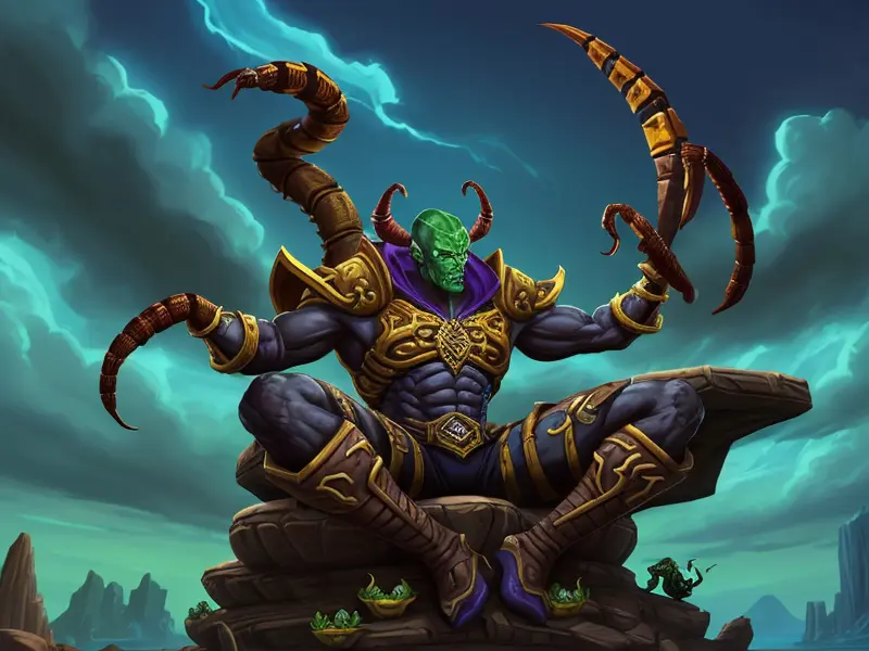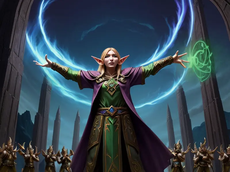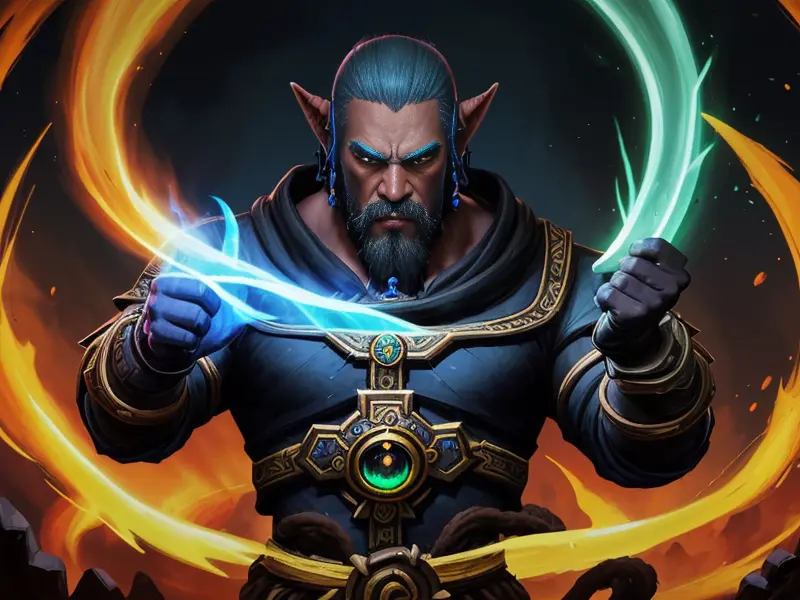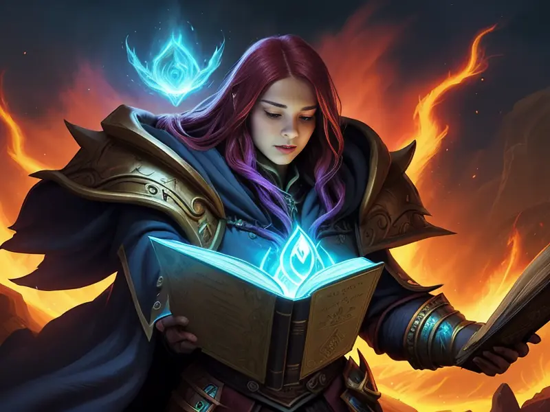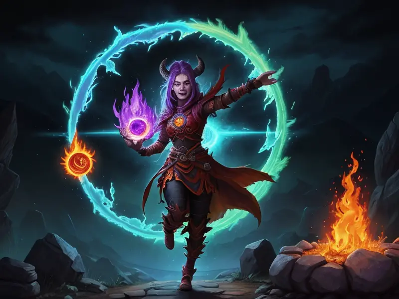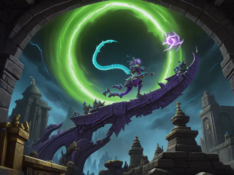 Illustration of Heroic Python, Launching spells mid-flip in gravity-shifting temple, profile shot, warcraft style, colorful and fun