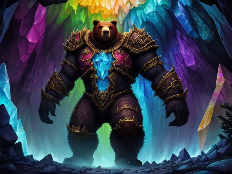 Illustration of Charismatic Dire Bear, In a crystal cave, colors dancing on their armor, wide angle shot, Weak, warcraft style, colorful and fun