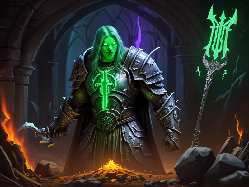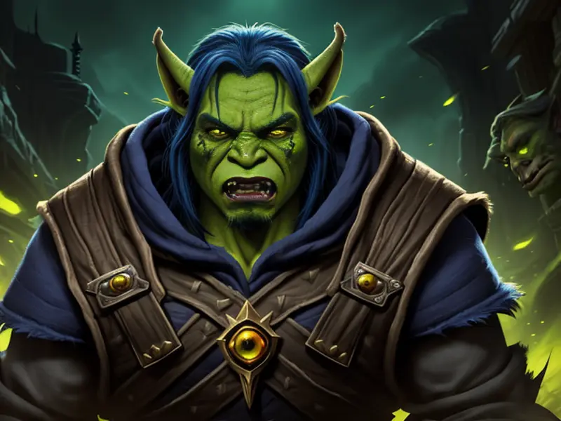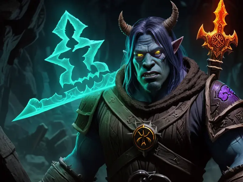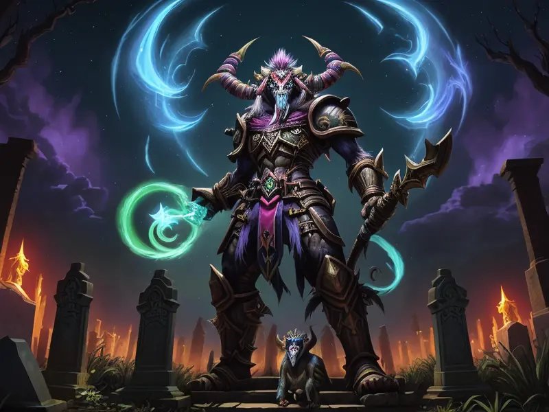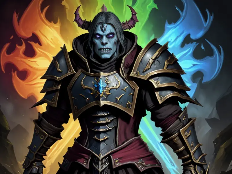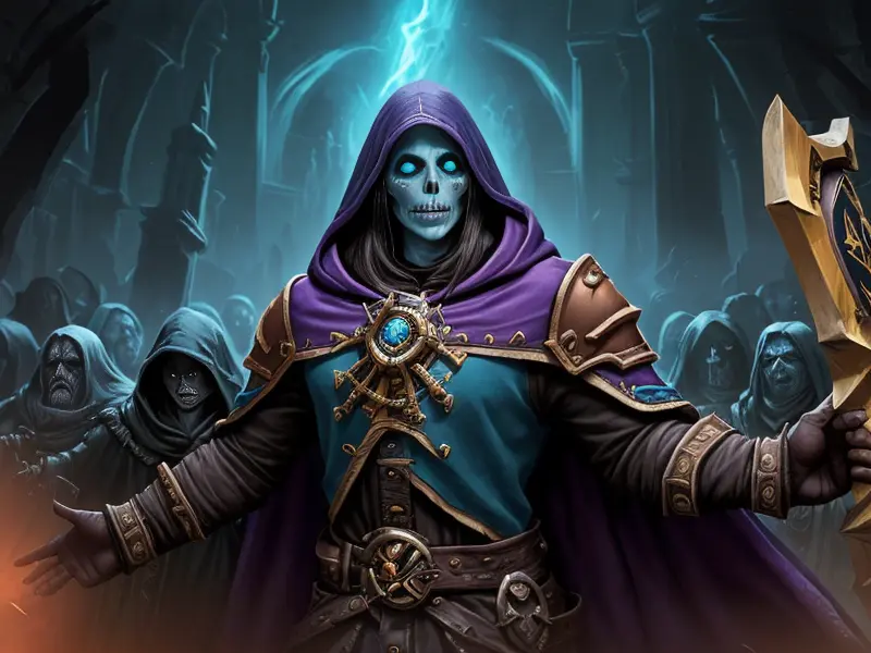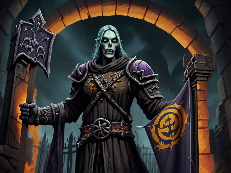 Illustration of Quick-witted Undead, Warlock, Eyes glow with golden light, Robust, warcraft style, colorful and fun