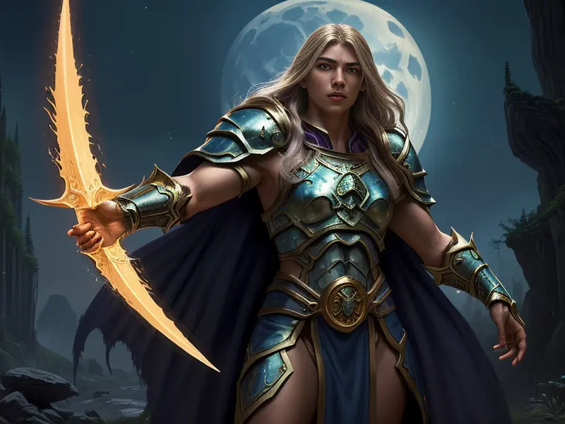 Illustration of Generous Human, Cleric, Bathed in moonlight, surrounded by a mystical aura, full-body shot, heroic fantasy human, realistic human face, natural skin tones, normal human anatomy, Powerful, Robust, warcraft style, colorful and fun