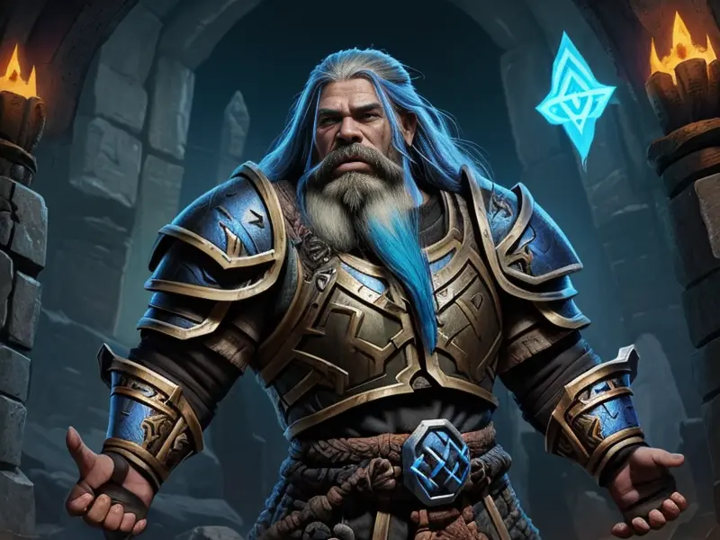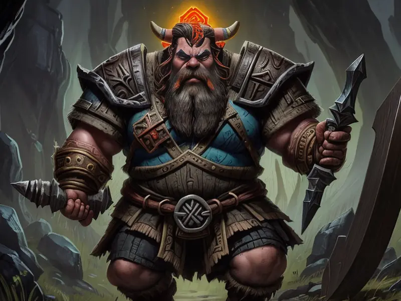 Illustration of Rune-marked Dwarf, Enchanter, Bones visible beneath torn armor, high angle shot, Powerful, Robust, warcraft style, colorful and fun