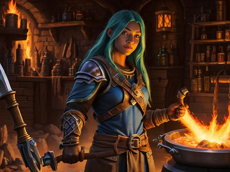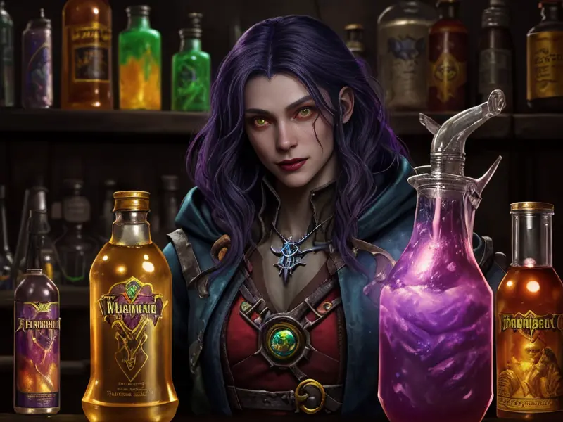 Illustration of Brave Human, Vampire, In an alchemist’s lab, mixing glowing liquids, eye-level shot, heroic fantasy human, realistic human face, natural skin tones, normal human anatomy, warcraft style, colorful and fun