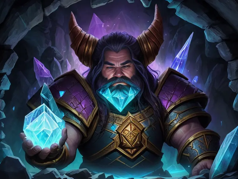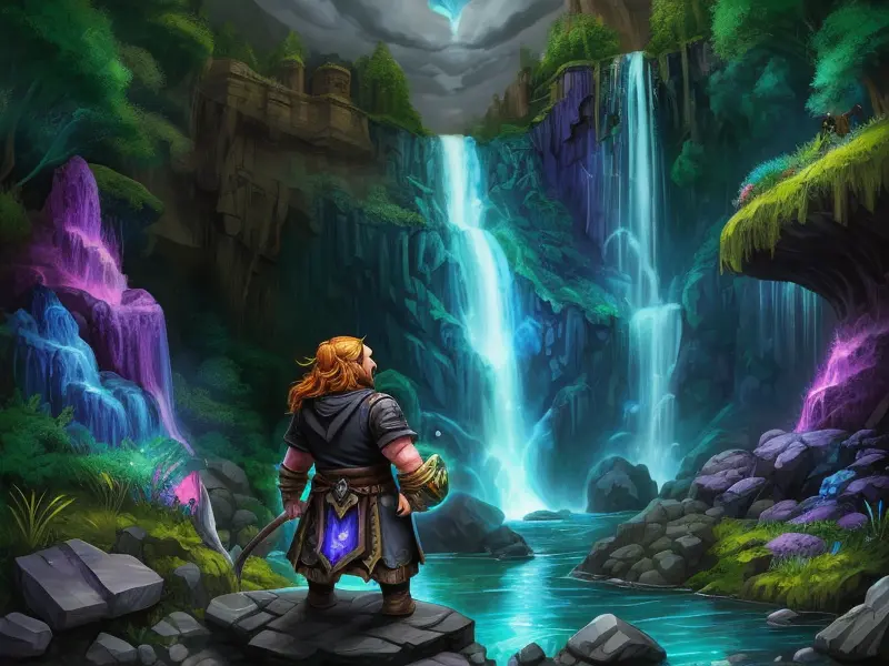 Illustration of Brave Dwarf, Illusionist, At the base of a waterfall, holding a shimmering gemstone, Fragile, warcraft style, colorful and fun