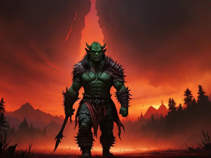 Illustration of Fierce Orc, Hunter, Walking through a rain of ash under a red sky, warcraft style, colorful and fun