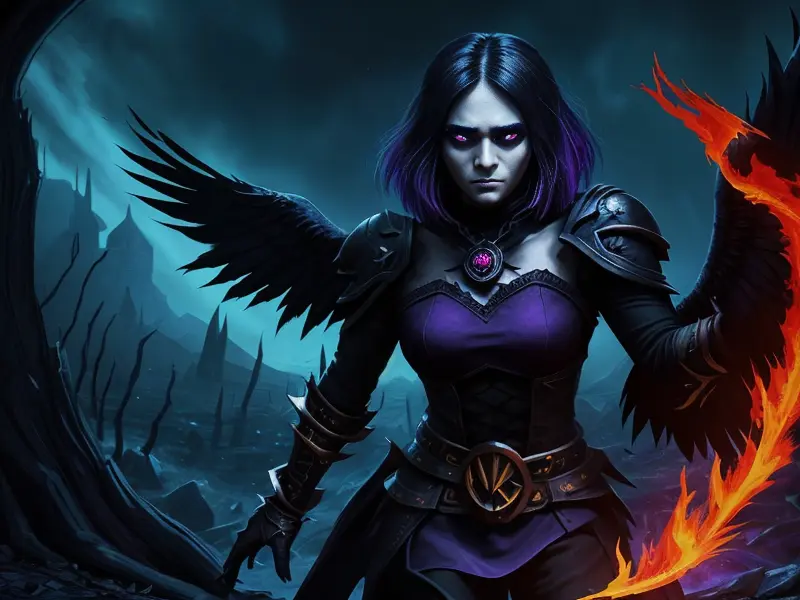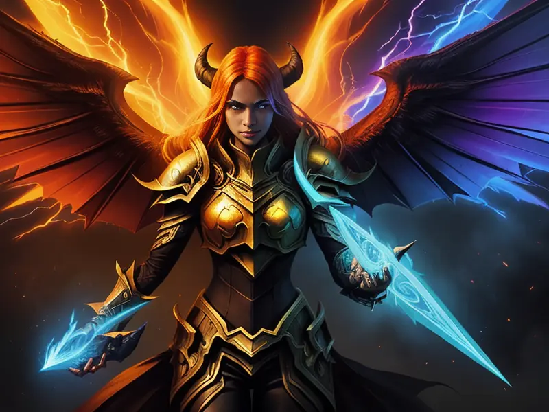 Illustration of Ember-eyed Demon, Paladin, Wings of shimmering light, dynamic angle, Robust, warcraft style, colorful and fun