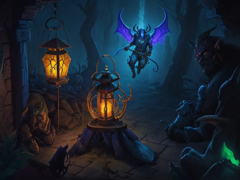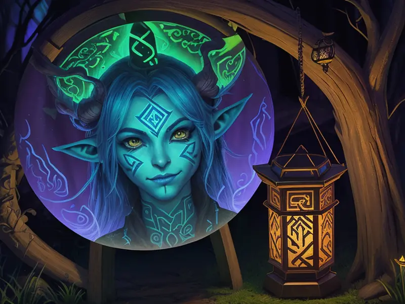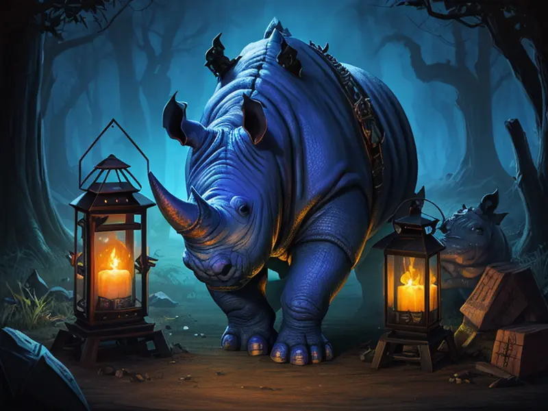Illustration of Vindictive Rhino, A lantern filled with blue witchfire, warcraft style, colorful and fun