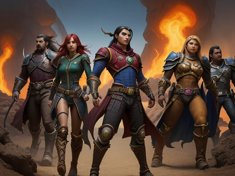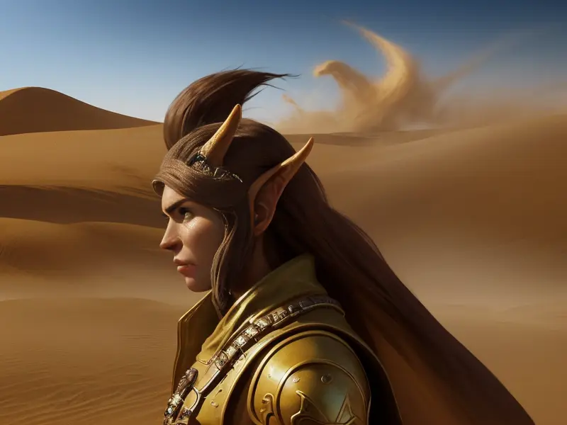 Illustration of Quick-witted Human, Elementalist, Leading charge through desert sandstorm, profile shot, heroic fantasy human, realistic human face, natural skin tones, normal human anatomy, Powerful, Robust, warcraft style, colorful and fun