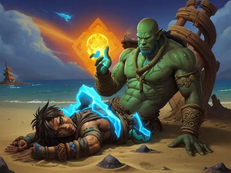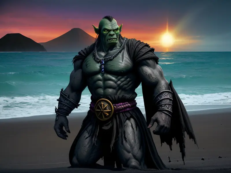 Illustration of Spectral Orc, Chronomancer, On a beach of shimmering black sand, waist-up shot, Weak, warcraft style, colorful and fun