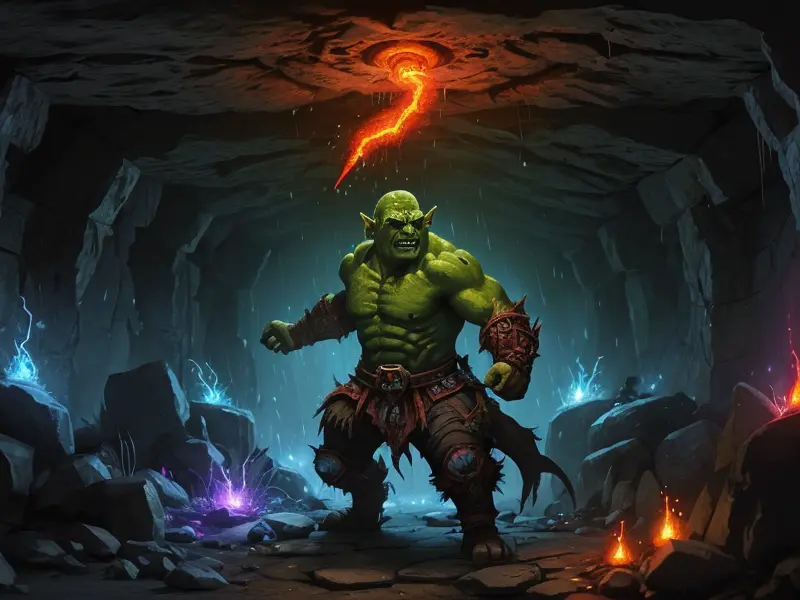 Illustration of Vindictive Orc, Blood Mage, In a subterranean forge, sparks raining like fireflies, dynamic angle, Powerful, Robust, warcraft style, colorful and fun