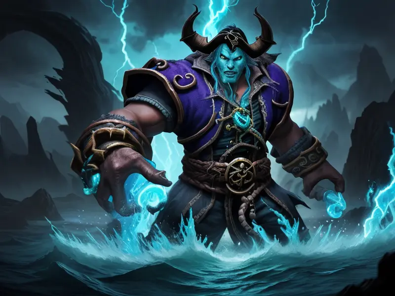 Illustration of Stormforged Water Elemental, Pirate, Eyes that glow when casting spells, Powerful, Robust, warcraft style, colorful and fun