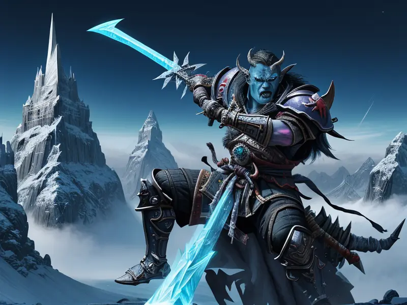 Illustration of Celestial Orc, Samurai, Hurling frost spears atop icy spire, high angle shot, warcraft style, colorful and fun