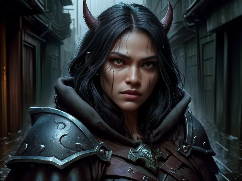 Illustration of Fierce Human, Warrior, In a rain-soaked alley, cloak dripping with darkness, medium close-up, heroic fantasy human, realistic human face, natural skin tones, normal human anatomy, Powerful, Robust, warcraft style, colorful and fun