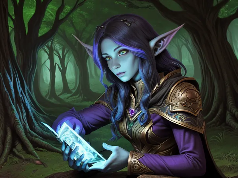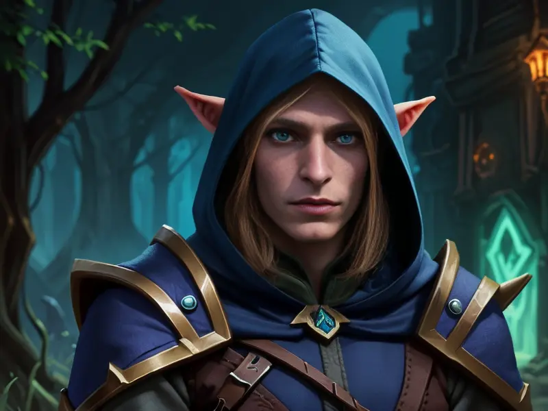 Illustration of Loyal Elf, Engineer, Cloak that makes them invisible at night, medium close-up, warcraft style, colorful and fun