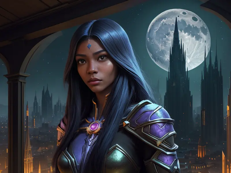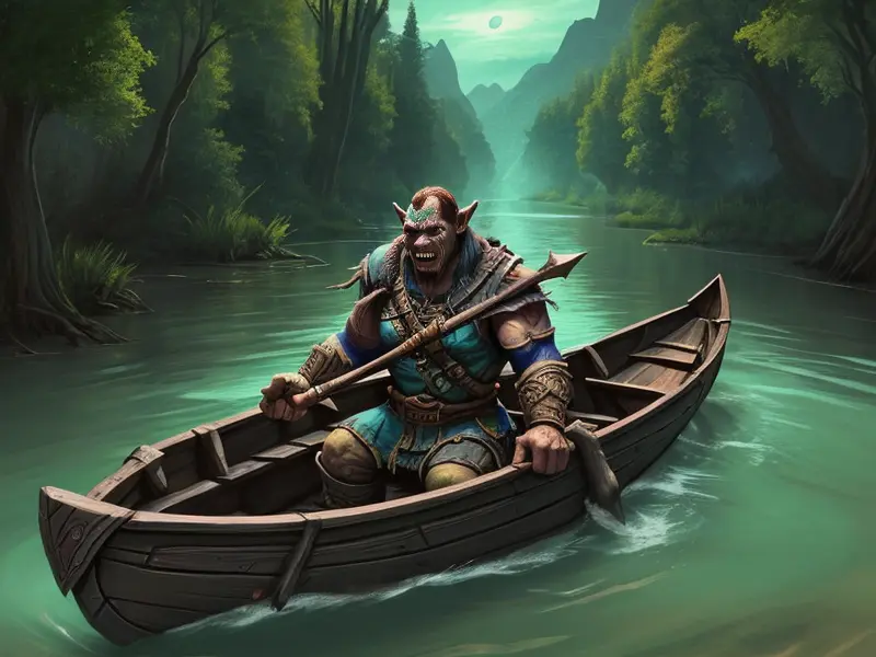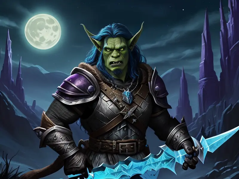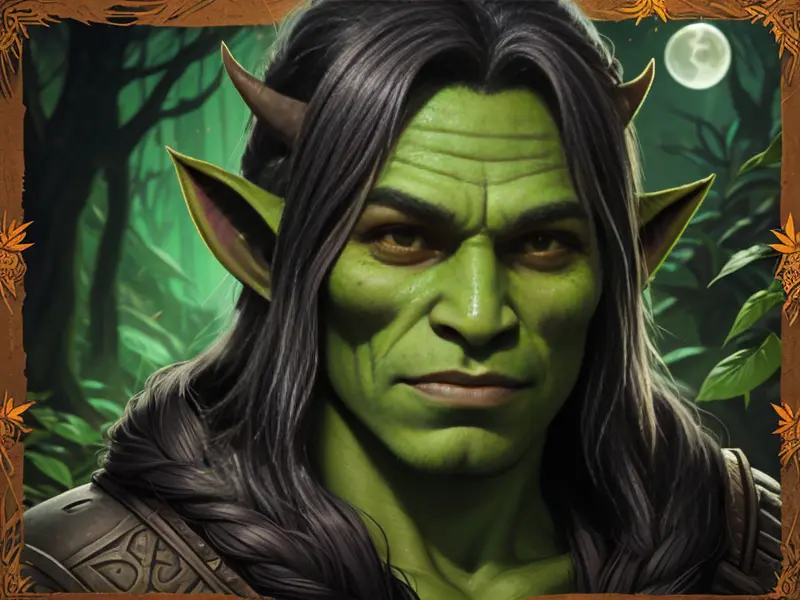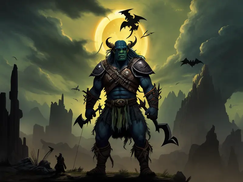 Illustration of Brave Orc, Witch, Sword made of crystallized moonlight, shoulder-level shot, Weak, warcraft style, colorful and fun