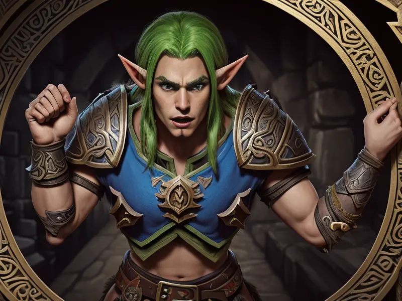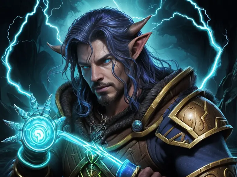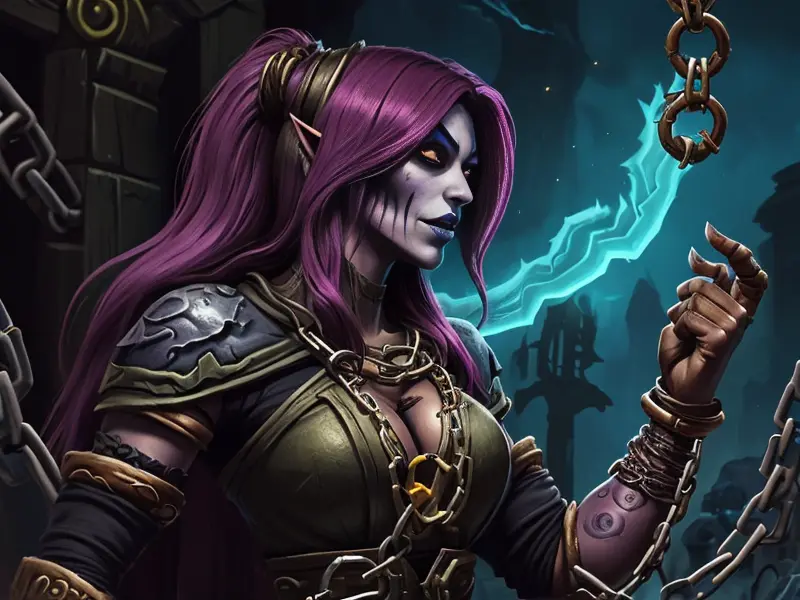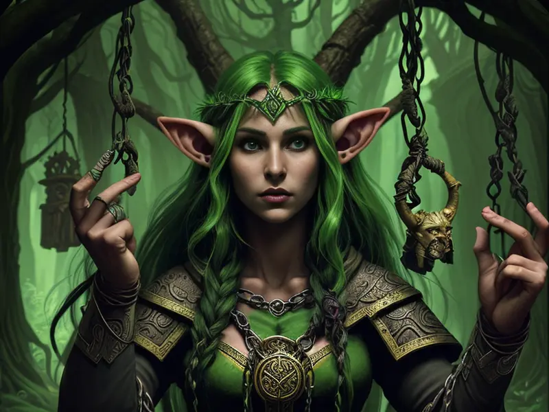 Illustration of Ancient Elf, Druid, In a labyrinth of hanging chains, echoes whispering secrets, Powerful, Robust, warcraft style, colorful and fun