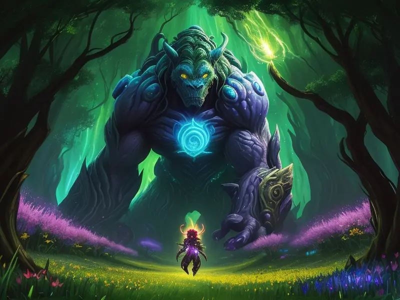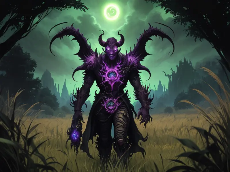Illustration of Corrupted Demon, Artificer, In a field of tall grass, eyes watching from every direction, Robust, warcraft style, colorful and fun