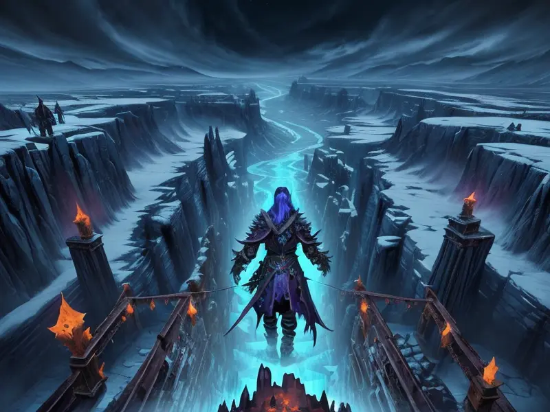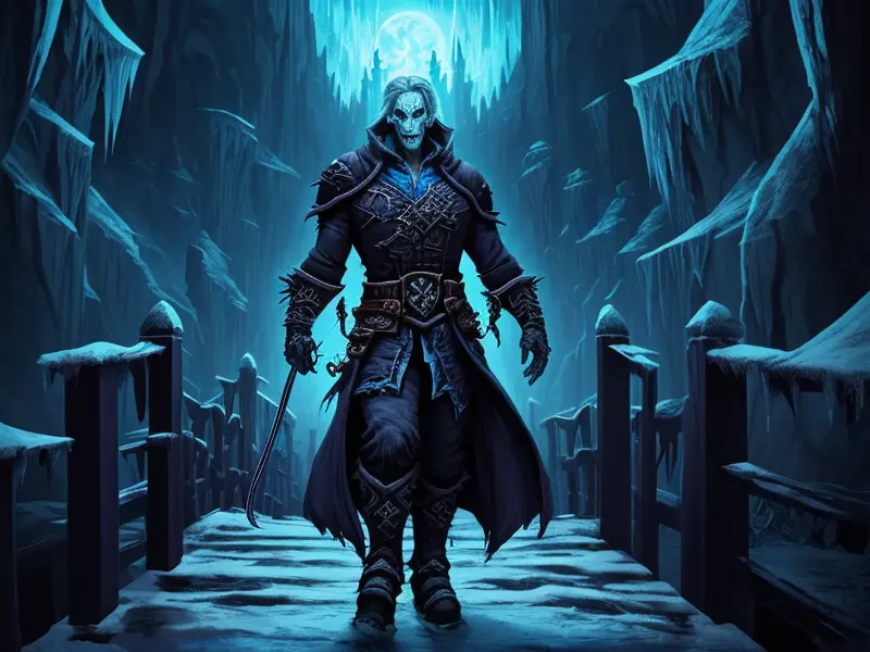 Illustration of Merciless Undead, Geomancer, On a frozen bridge above a bottomless abyss, high angle shot, Robust, warcraft style, colorful and fun