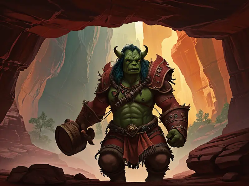 Illustration of Noble Orc, Runemaster, In a canyon of red rock, echoing with distant drums, warcraft style, colorful and fun