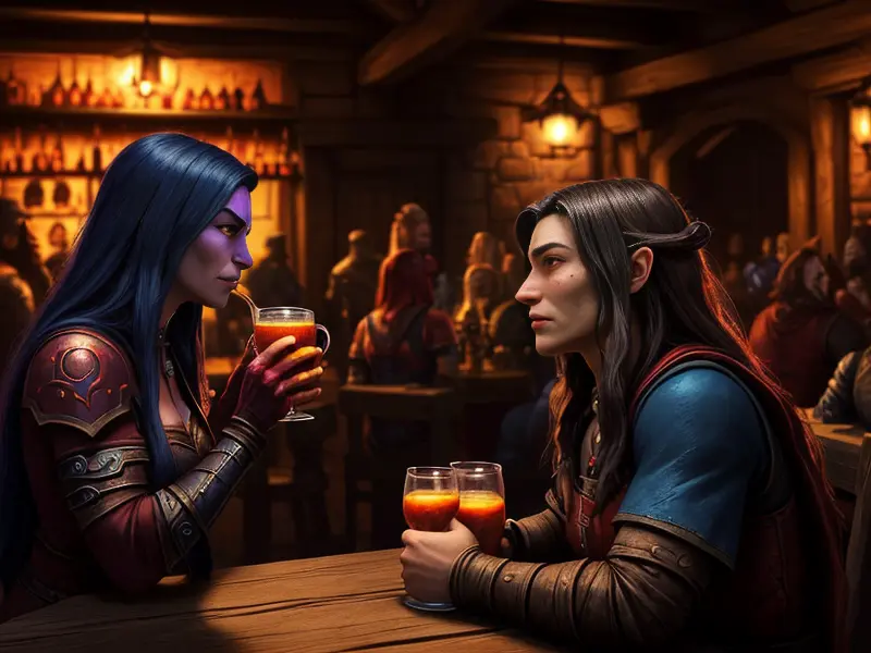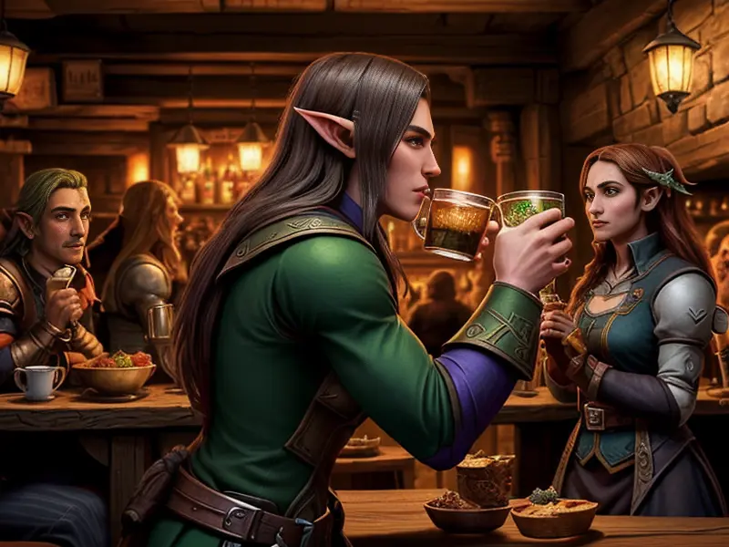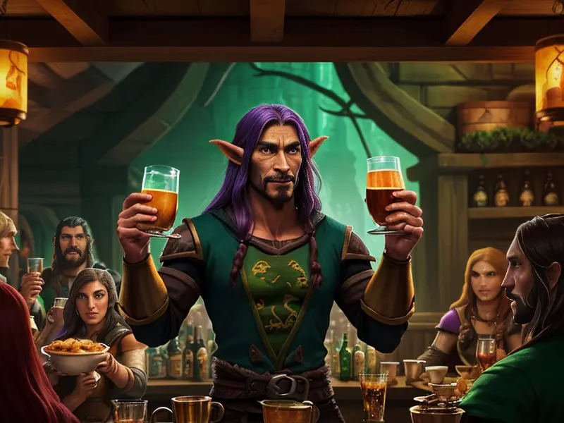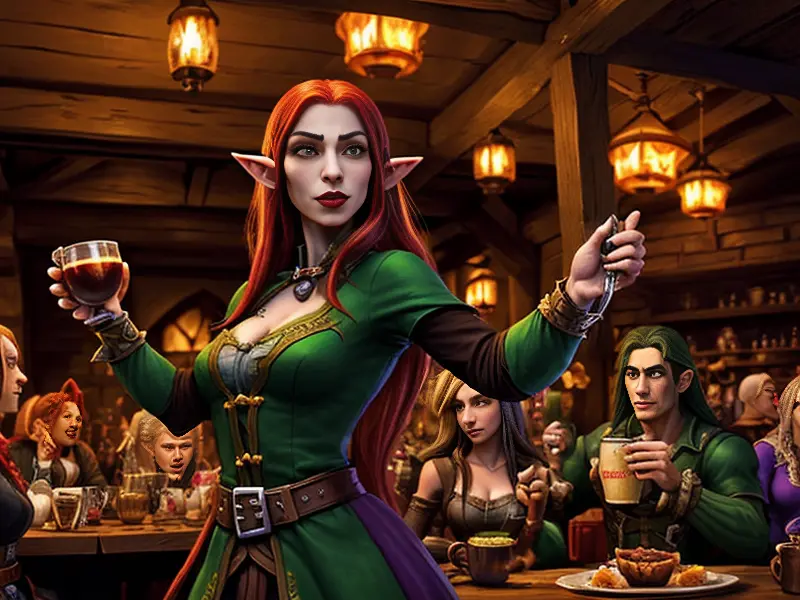 Illustration of Ember-eyed Elf, Beastmaster, In a bustling tavern, raising a mug for a toast, eye-level shot, warcraft style, colorful and fun